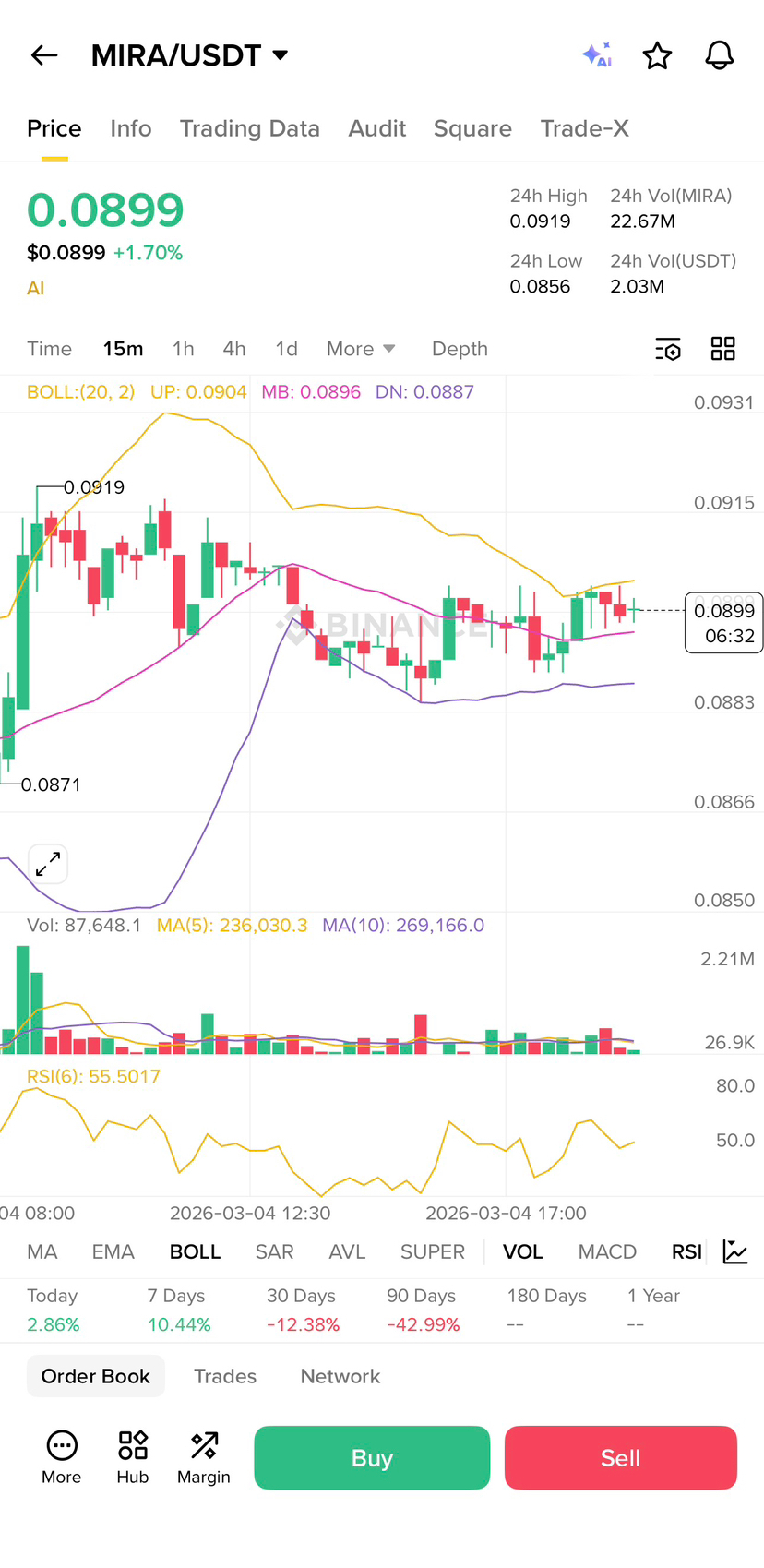Today I was checking $MIRA chart and honestly something very interesting is forming. Price now trading around $0.0899 with small green move +1.70%, but what is more important is how the Bollinger Bands (20,2) behaving on this 15m timeframe.