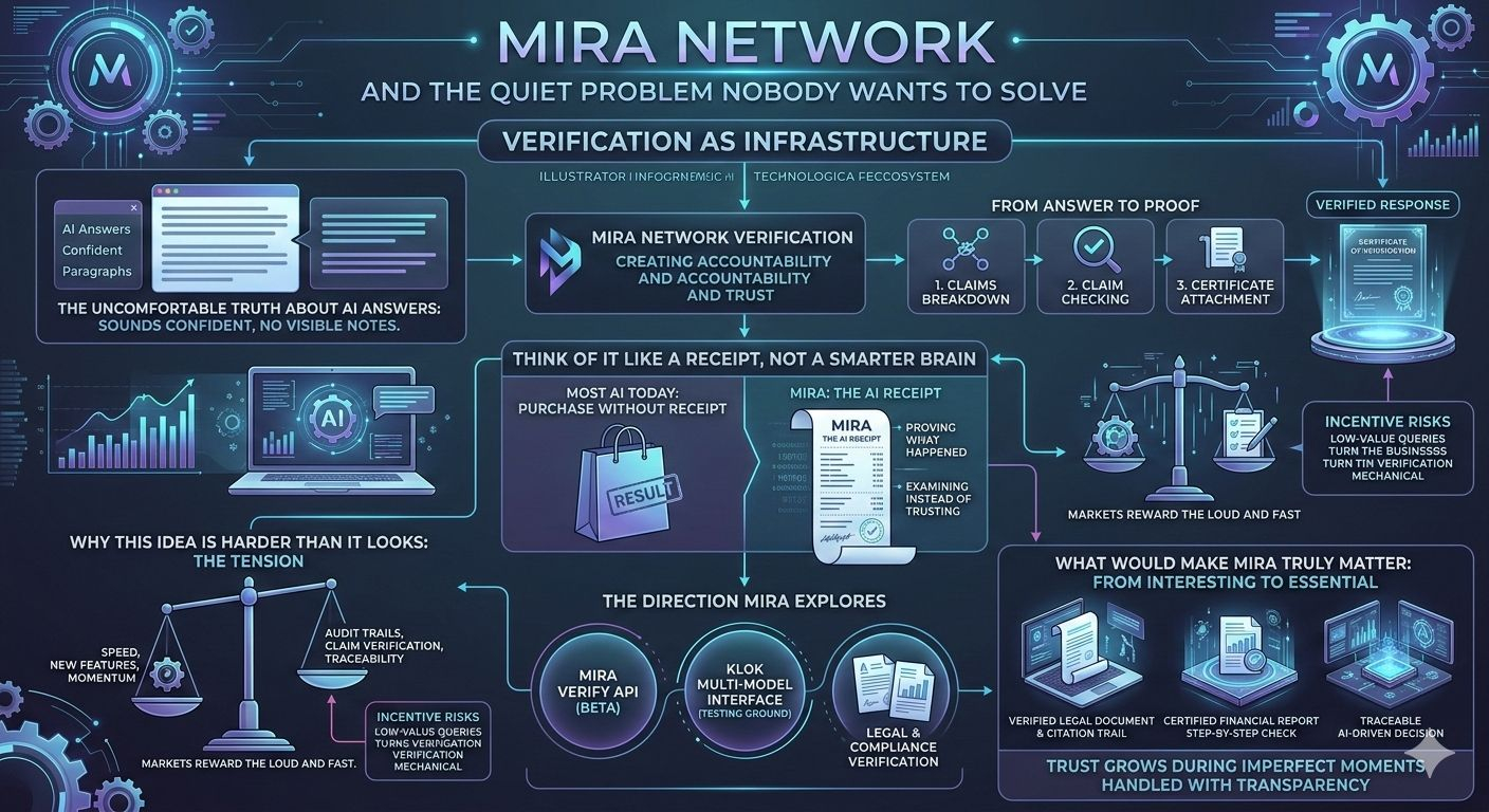 Mira isn’t trying to build a louder AI model or another flashy interface. The core instinct behind the project is simpler than that: AI answers shouldn’t appear without a trail. When a system gives you information, there should be a way to look back later and understand how that answer came together.