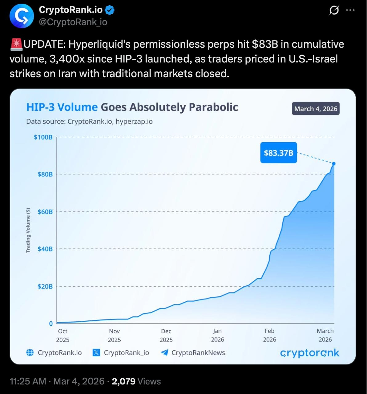 During US-Israeli strikes on Iran (March 1-2), Hyperliquid became the primary real-time price discovery venue for oil and commodities