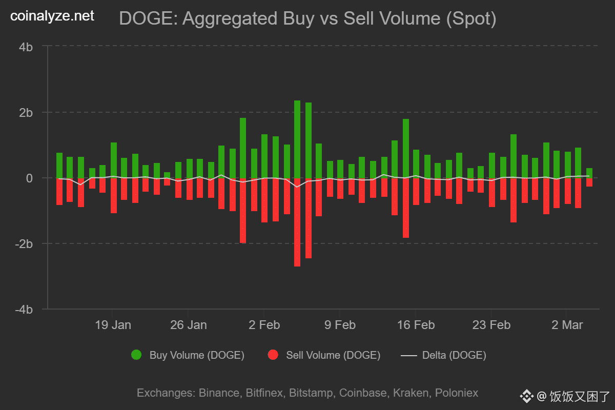 短期来看,DOGE从0.088美元低点反弹至0.092美元,买入量为3.04亿枚,卖出量为2.63亿枚,买盘略微占优,推动价格上涨。