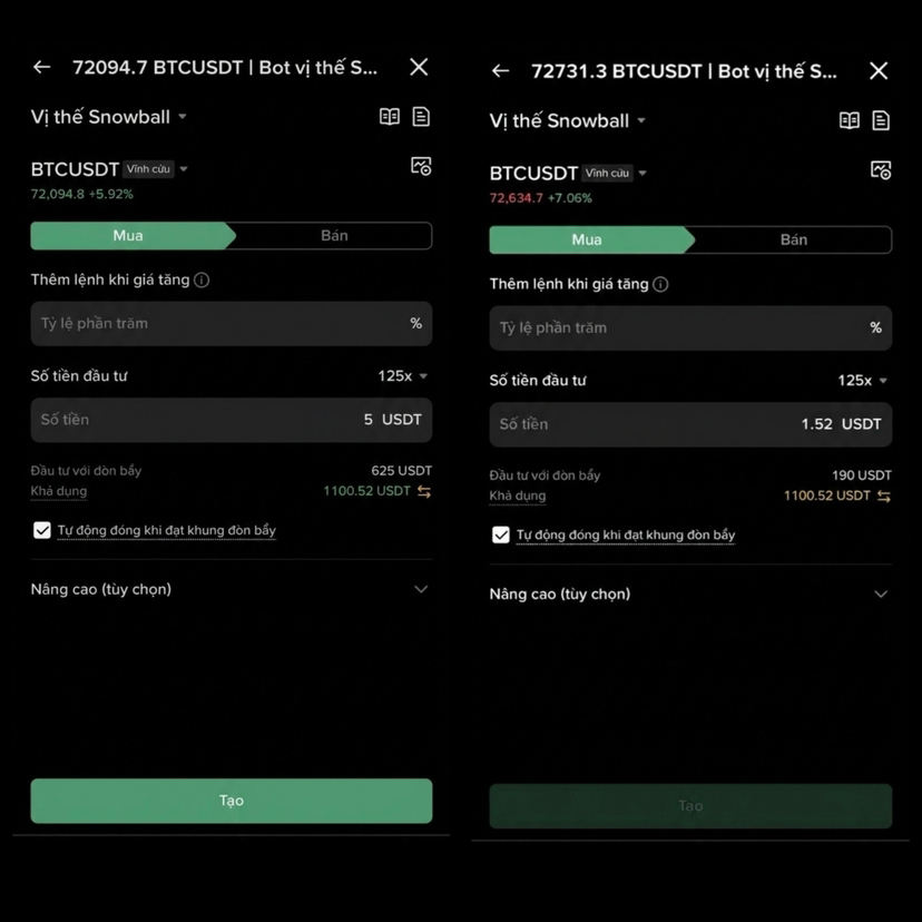 Ví dụ đơn giản. Một bạn mở vị thế Long BTC tại mức giá 70,000 USDT và thiết lập Snowball bot thêm vị thế mỗi khi giá tăng 2%.