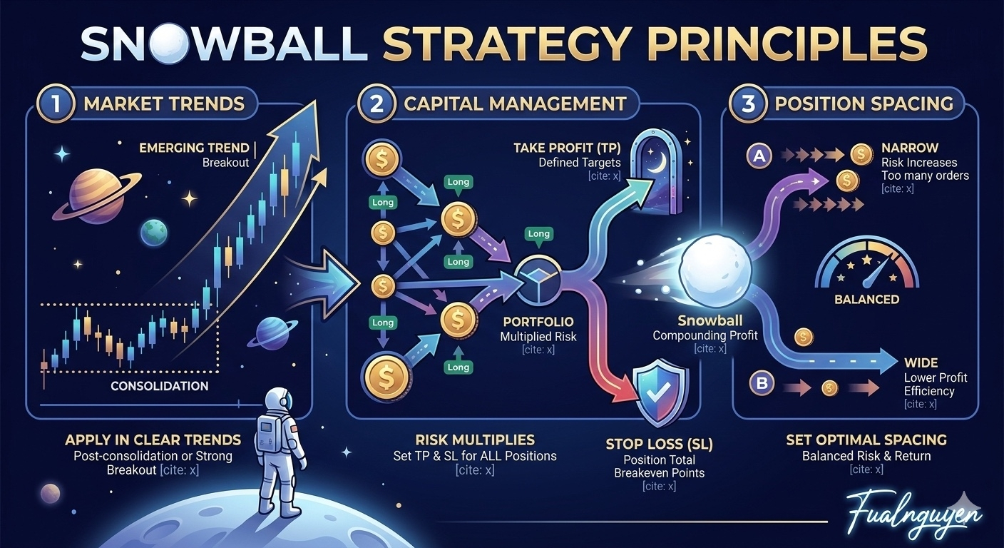 Cơ chế hoạt động của Snowball dựa trên một nguyên tắc quen thuộc trong trading chuyên nghiệp gọi là pyramiding - chiến lược kim tự tháp. Thay vì gia tăng vị thế khi thị trường đi ngược, nhà giao dịch sẽ chỉ tăng vị thế khi thị trường đi đúng hướng. Điều này giúp tối đa hóa lợi nhuận trong các giai đoạn thị trường có xu hướng mạnh.