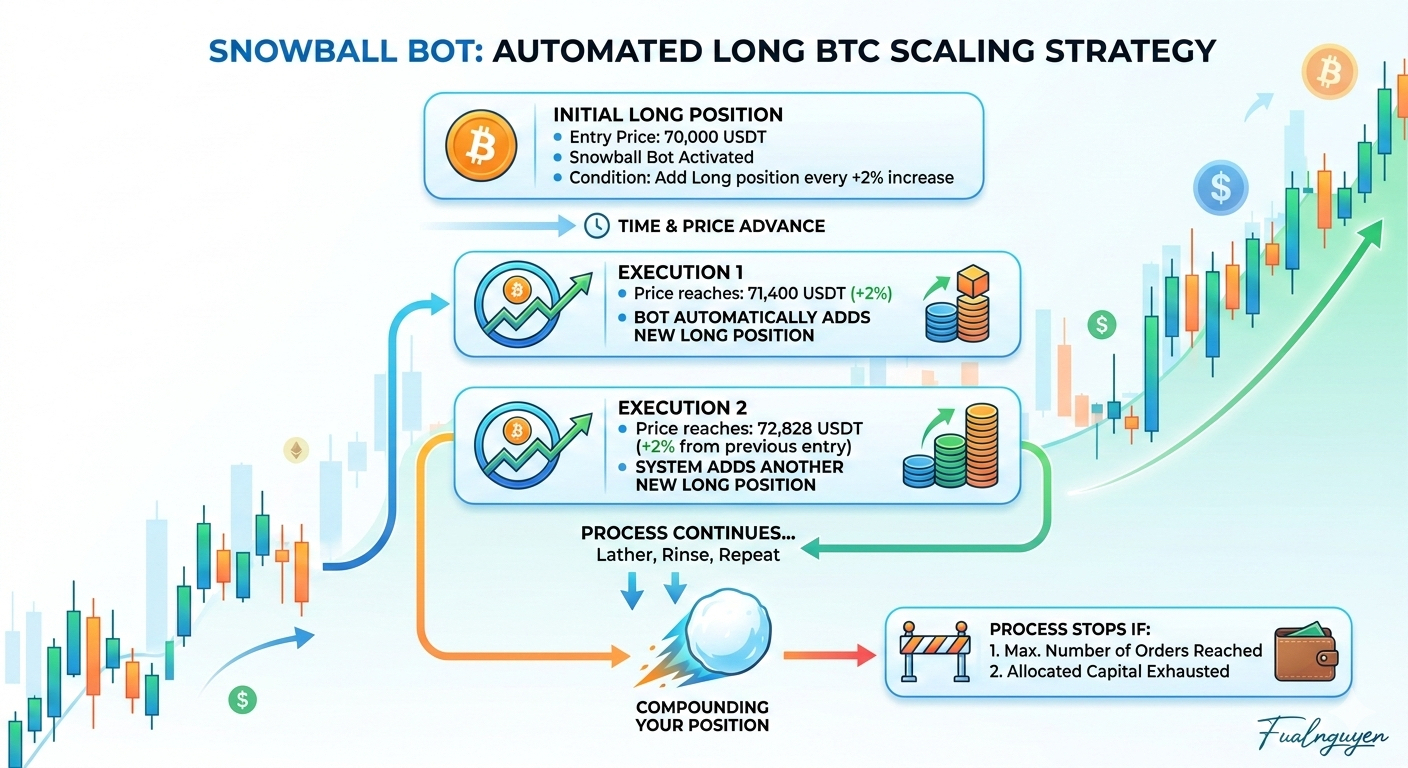 Trên Binance, Bot Vị thế Snowball được thiết kế để tự động mở rộng vị thế khi giá đi đúng hướng. Ý tưởng của chiến lược này khá đơn giản. Khi bạn đúng xu hướng, thay vì giữ nguyên một vị thế nhỏ ban đầu, hệ thống sẽ liên tục thêm các lệnh mới theo từng bước giá nhất định. Điều này khiến tổng vị thế của bạn ngày càng lớn, giống như một quả cầu tuyết lăn xuống dốc và càng lúc càng phình to.