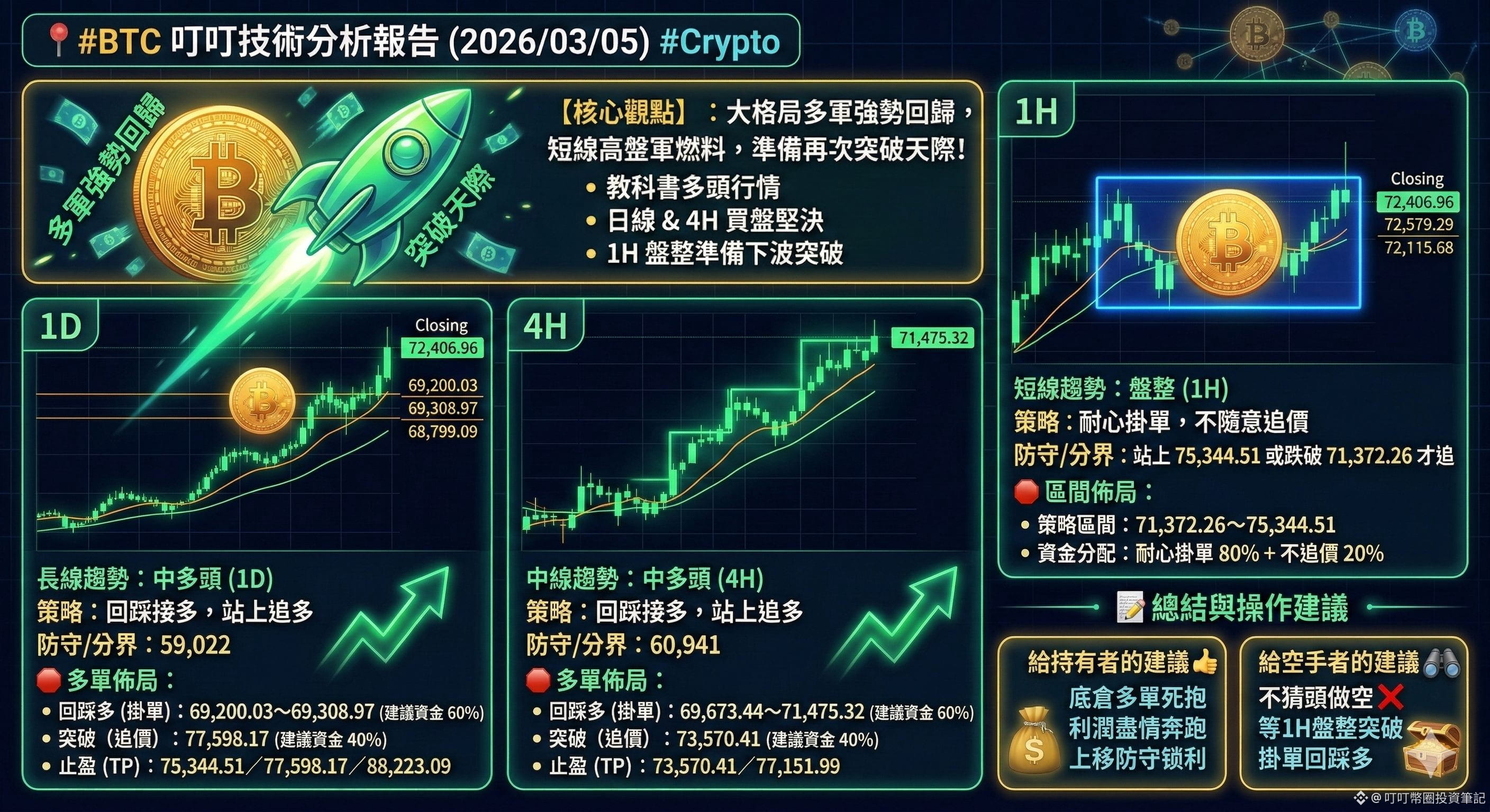 • 回踩多 (掛單):69,673.44~71,475.32 (建議資金 60%)