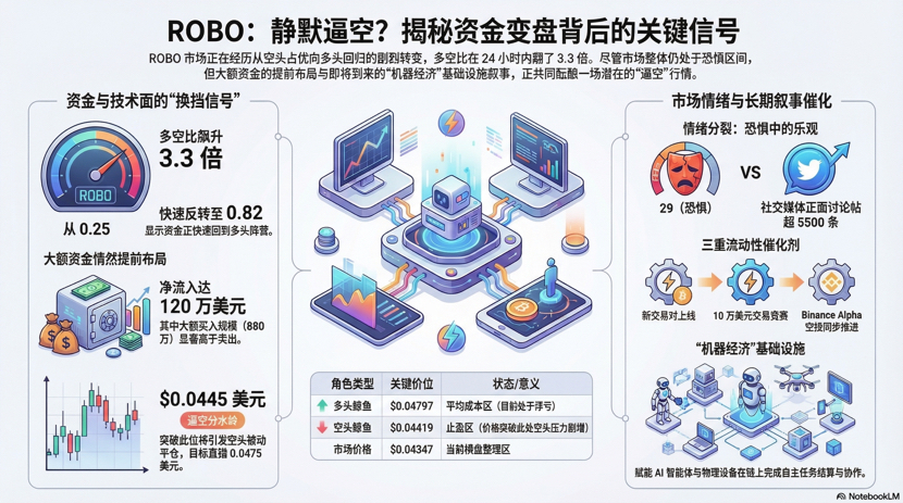 最近很多人只盯着K线看 $ROBO 一周涨了4%,但真正值得警惕的信号,其实藏在资金结构里。过去24小时,多空比从0.25直接飙到0.82,整整翻了3.3倍。这意味着原本大量押注下跌的资金,正在快速转向做多。市场表面很安静,但水面下的方向已经开始改变。
