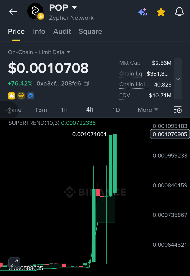 Looking at the current on-chain data, $POP trading at $0.0010708, showing incredible bullish momentum on the 4-hour chart. With a Market Cap of approximately $2.56M and an FDV of $10.71M, this low-cap gem is catching the eyes of many "degen" traders and long-term believers alike.