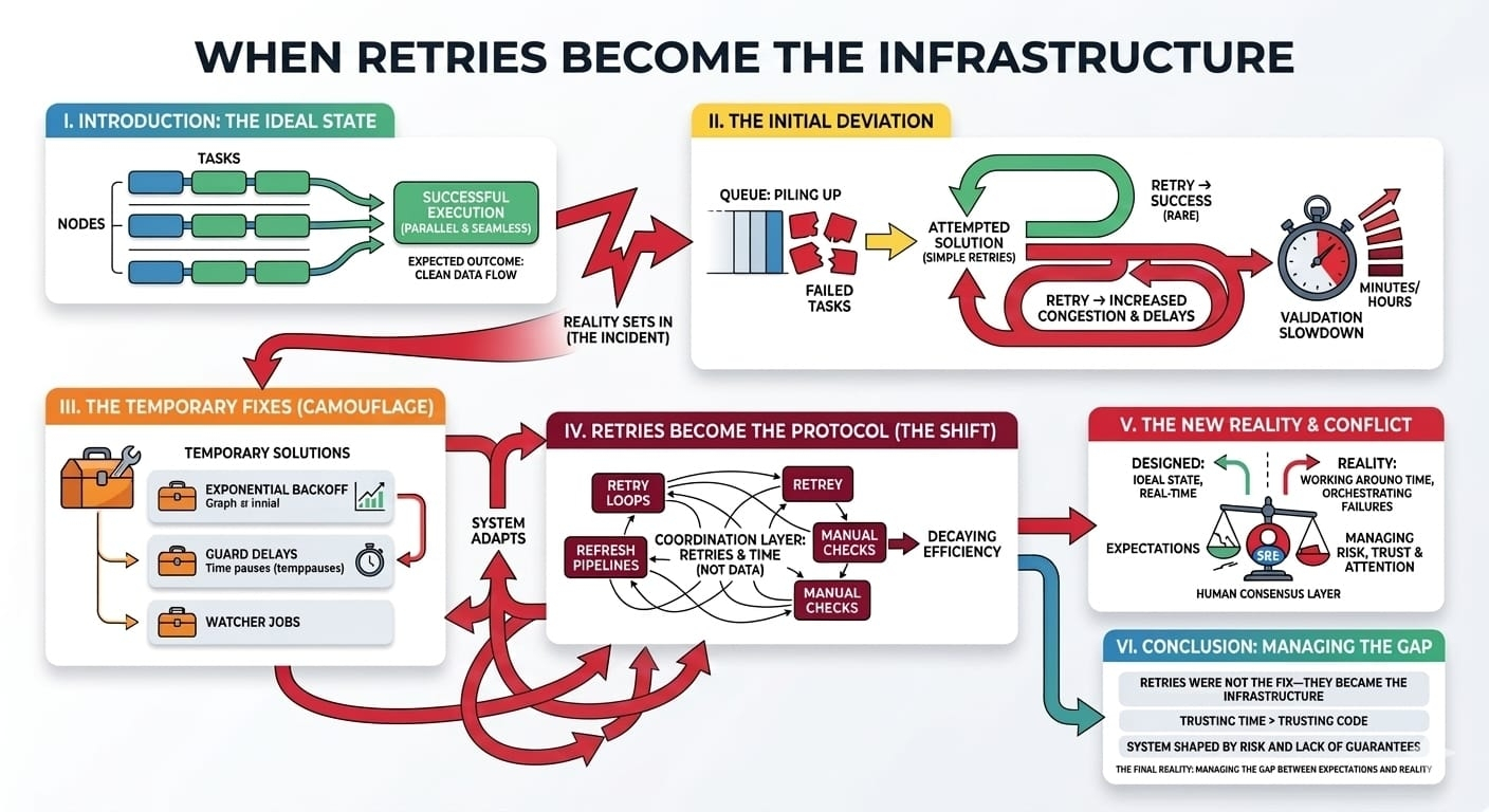 I began to notice that this shift was happening everywhere. It wasn’t just retries anymore. We started adding refresh pipelines, tasks that would recheck previous stages to ensure that stale data didn’t cause issues down the line. Then, manual checks—simple scripts run by the engineers themselves—became a standard part of the workflow. What we had initially thought of as an automated system quickly became a hybrid of automation and human oversight, with each retry loop acting as a manual intervention. It was as if automation had slipped into a state where the only way to ensure success was by adding more layers of automation that could react to the very failures the first automation layer was supposed to prevent.