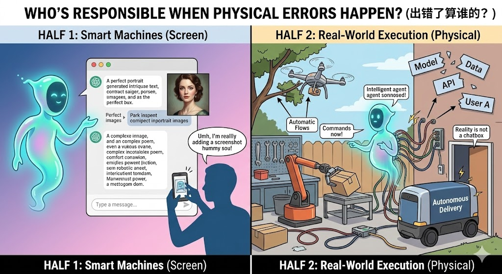 这背后像在提示一个行业信号:AI 的上半场,是让机器会说话、会写字、会做图;下半场更麻烦,是让机器在现实里“办事”,而且办事时别出大乱子。现实世界不是对话框,它有门槛、有权限、有责任边界。一个模型在屏幕里胡说八道,你最多截图吐槽;它一旦开始指挥无人机、调度机械臂、替你下单付款,问题就不再是“聪不聪明”,而是“出错了算谁的”。更要命的是,自动化一旦串起来,责任也会跟着碎成很多片:你问 A,A 说是模型;你问模型,模型说是数据;你问数据,数据说是接口;最后你对着空气发火。