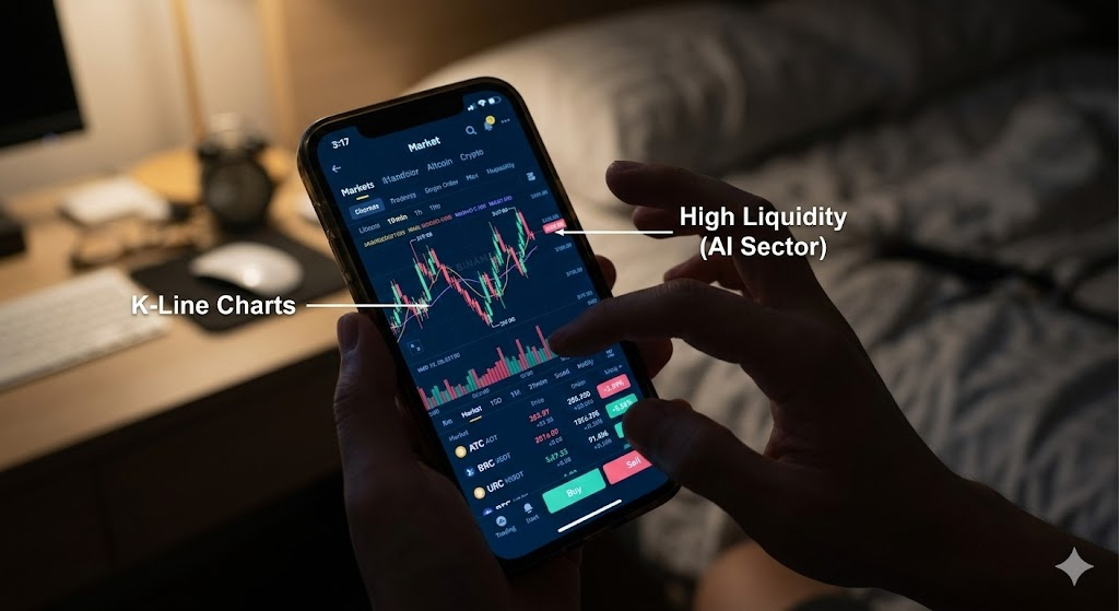 昨晚睡前我又开了币安,手指像有肌肉记忆一样先点进行情页,再滑到自选。几只山寨一红一绿,心情跟着抖两下,然后我就开始做那种没意义的动作:拉近一点看 15 分钟线,再切回 1 小时线,像这样就能把不确定性按住。刷到 AI 板块时我停了一下,不是因为它涨,而是它“还在被交易”——跌的时候也有人接,反弹的时候也有人追,流动性像没断过气。