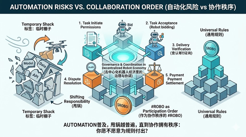 我反而觉得,这种“责任碎片化”会成为机器人时代最大的阻力。硬件会越来越便宜,模型会越来越强,可系统只要缺一套大家都认的规矩,协作就会像临时拼起来的棚子:平时看着能用,一刮风就散架。你越自动化,越依赖这种规矩来划清边界:谁能发起任务,谁能接,交付怎么验,争议怎么判,账怎么结。听起来无聊,但现实里最消耗人的,往往就是这些无聊的细节。我最近去翻了下 @Fabric Foundation 的内容,#ROBO 这个方向就把“去中心化机器人经济里的治理与协调”摆到台面上,让我突然意识到:市场可能在提前押注的,不是下一台更酷的机器人,而是那套让机器人能被组织、能被追问、能被结算的秩序。