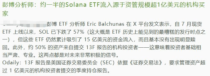 更重磅的是,他透露:约50%的资产来自提交了13F报告的机构投资者。 对于老司机来说,13F报告是美国证监会强制要求管理资产超1亿美元的机构披露的季度持仓报告。这代表什么?代表这些买入SOL的买家,不是散户,也不是游资,而是严肃、专业的长线资金!