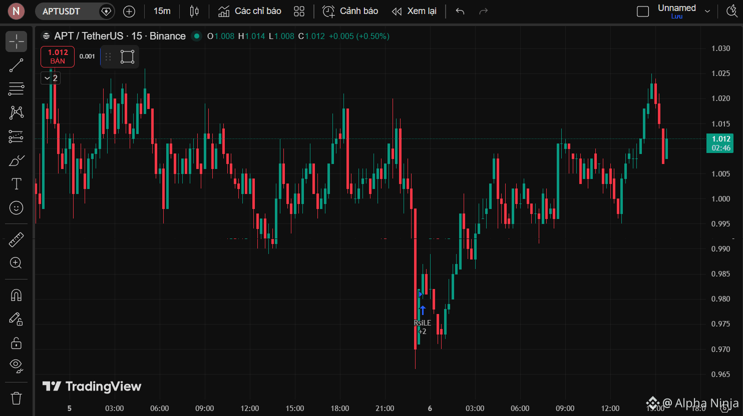 Cú sập mạnh về 0.972 đã hoàn thành nhiệm vụ quét sạch các vị thế Long đòn bẩy cao. Ngay sau đó, tín hiệu RsiLE +2 xuất hiện đi kèm với các nến thân dài, cho thấy dòng tiền thông minh (Smart Money) đã nhập cuộc bắt đáy cực kỳ quyết liệt. Với việc lấy lại mốc 1.01, APT đang hình thành cấu trúc phục hồi hình chữ V mạnh mẽ. Mục tiêu tiếp theo của nhịp tăng này sẽ là vùng kháng cự cũ quanh 1.025.