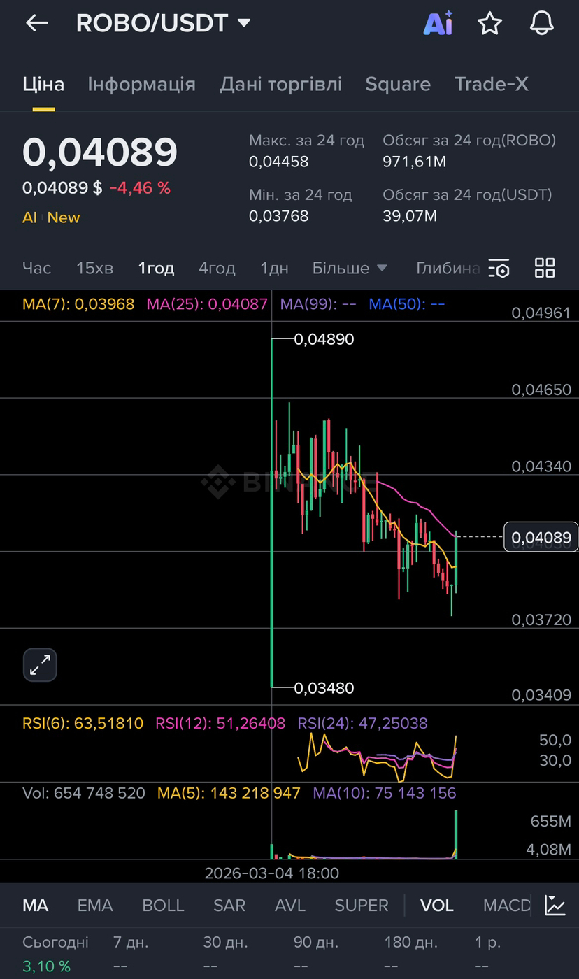 Ціна $ROBO на момент знімка ціна становить 0,04089 USDT.