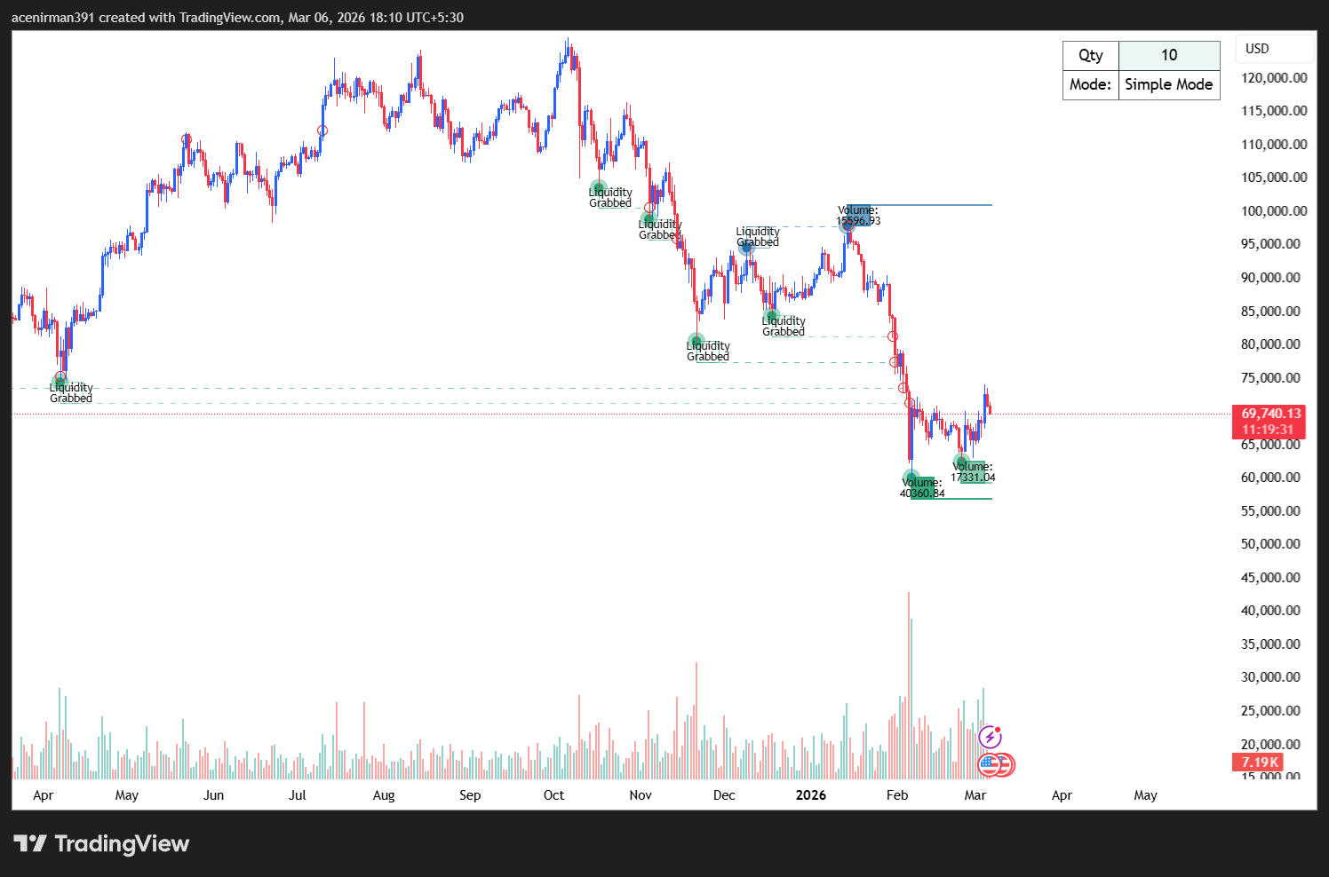 $BTC obecnie handluje w okolicach 72 000–73 000 dolarów, konsolidując się między kluczową strefą wsparcia w pobliżu 60 000 dolarów a oporem w okolicach 72 000–80 000 dolarów. 24 lutego doświadczyliśmy ostrego spadku do 62 900 dolarów, co wywołało falę paniki likwidacyjnej — a potem, gdy niedźwiedzie zaczęły się czuć komfortowo, Bitcoin odbił się mocno.