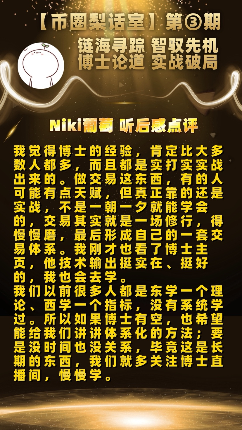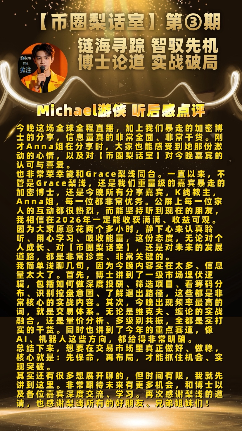 纵观整场深度分享,博士从交易体系、行情研判、选币方法论、风控铁律,到行业乱象、人生修行与未来布局,层层递进、句句干货,既讲交易之术,更传交易之道,字字皆为实战沉淀,句句皆是穿越牛熊的真知。整场分享既有雷霆风控的硬核,亦有温润通透的人生智慧,恰如“千淘万漉虽辛苦,吹尽狂沙始到金”,在浮躁的币圈中,为每一位行者点亮了方向。
