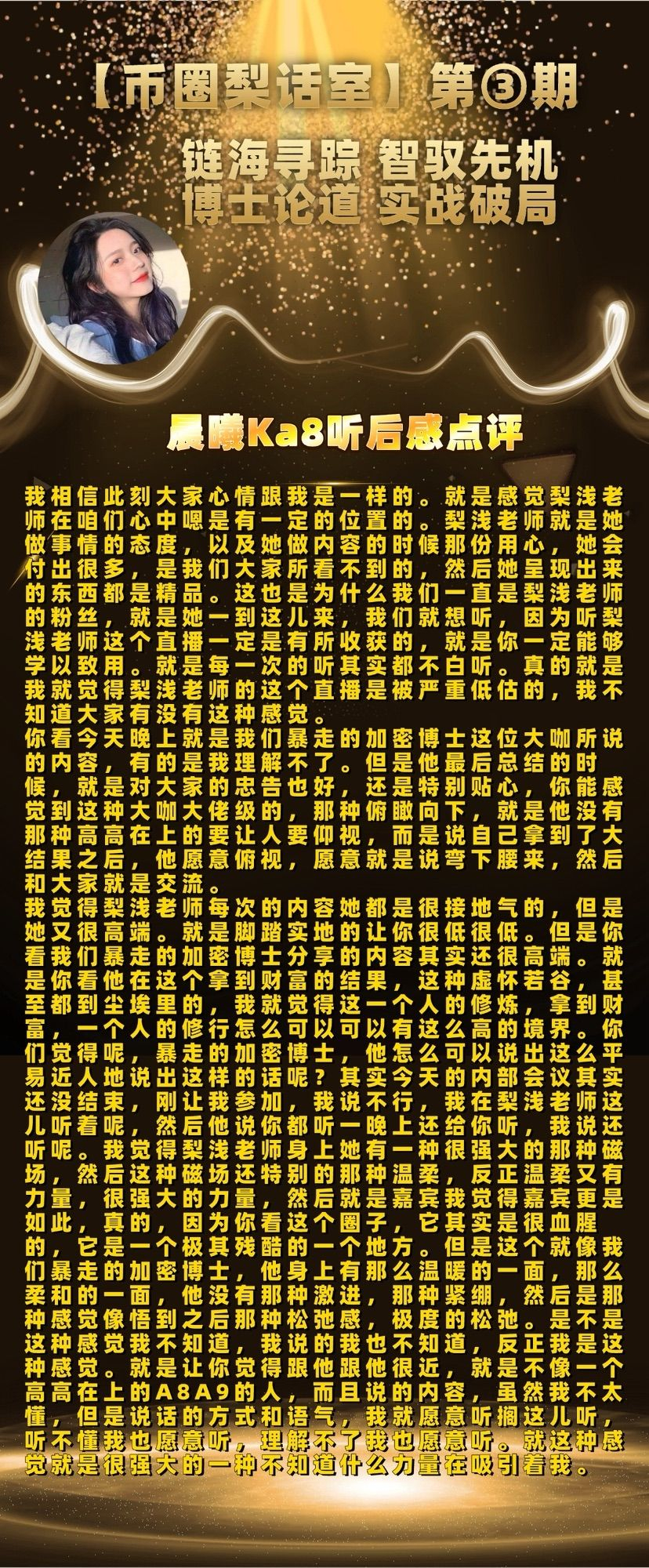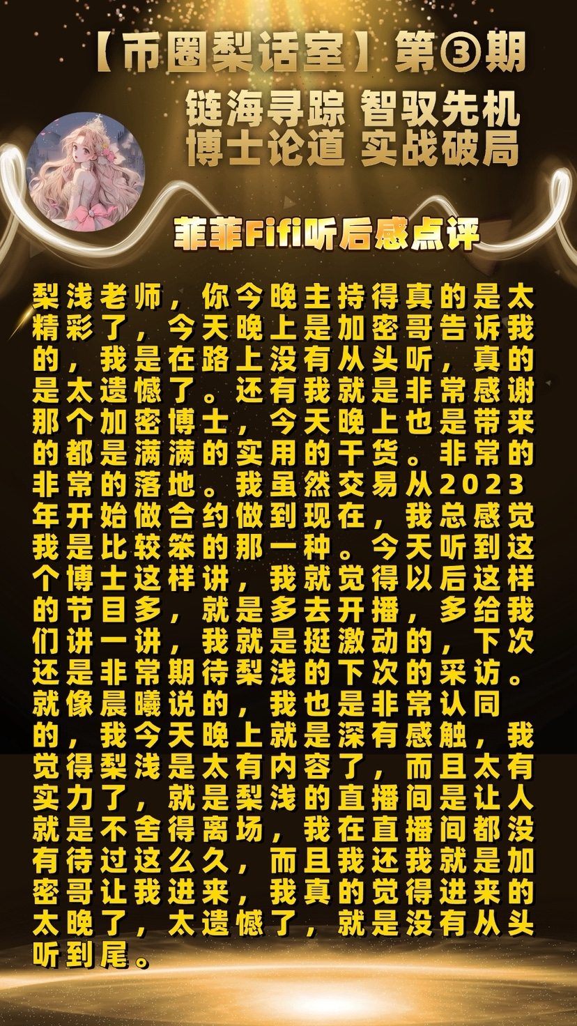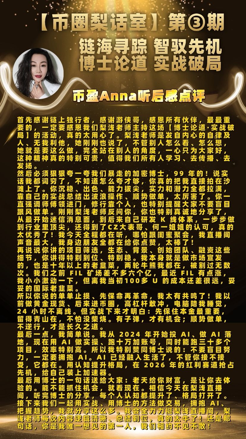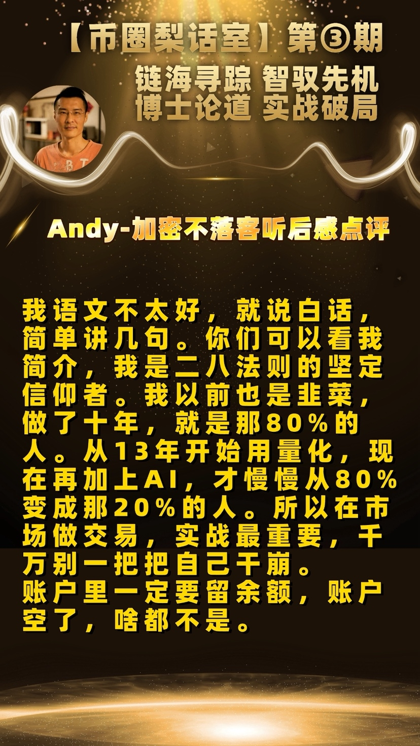 “运筹帷幄之中,决胜千里之外。” 不知不觉,【币圈梨话室】第三期昨晚在大家的支持中落幕。感谢暴走的加密博士近两小时毫无保留的干货输出、深度分享与真诚忠告。从行情研判到财富跃迁,从项目筛选到合约风控,从毒鸡汤破局到未来赛道布局,每一句话都直击本质,每一个方法论都落地可行,每一段忠告都发人深省。