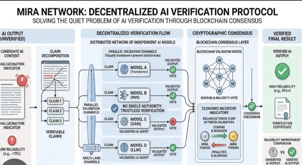 The Mira Network is a decentralized AI verification protocol designed to solve the growing problem of AI reliability. By combining artificial intelligence with blockchain consensus mechanisms, the network provides a system where AI outputs can be verified through multiple independent models before being accepted as trustworthy.