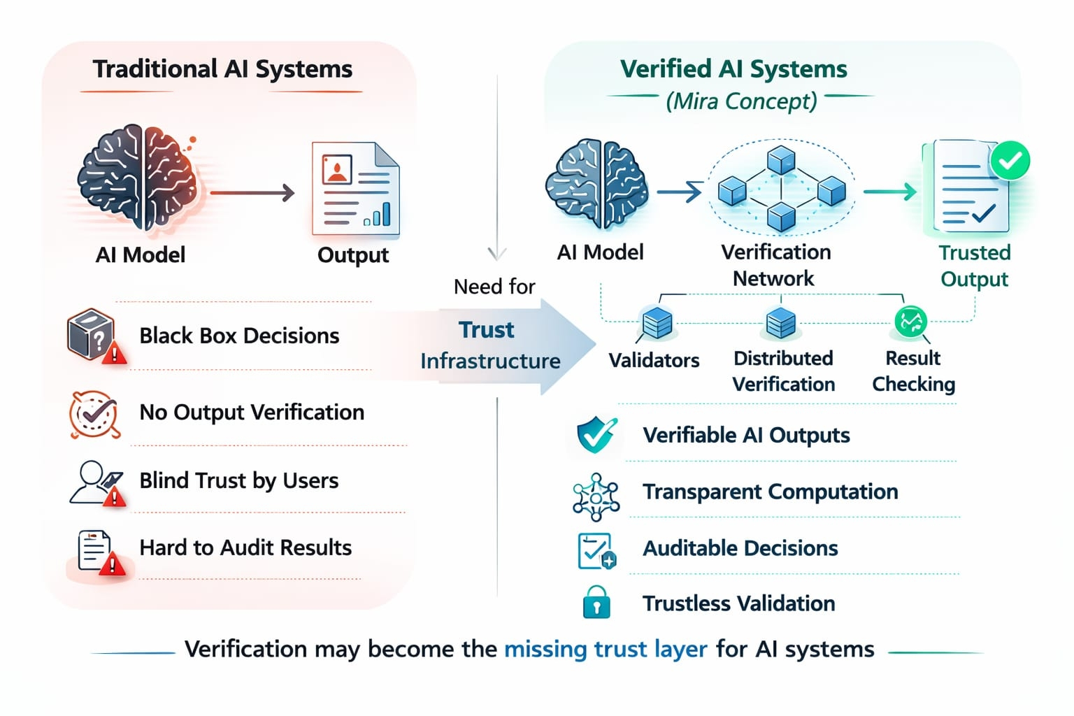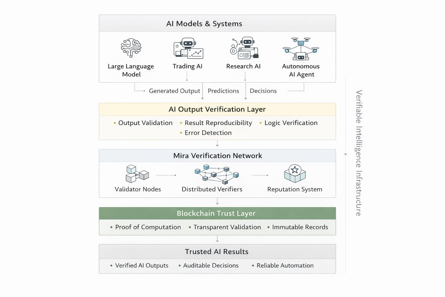 Mira podchodzi do tego problemu, wprowadzając warstwę weryfikacji dla wyników AI, wspieraną przez zdecentralizowaną infrastrukturę. Zamiast polegać na jednym systemie do potwierdzania wyników, sieć może weryfikować obliczenia i wyniki za pomocą rozproszonych uczestników.