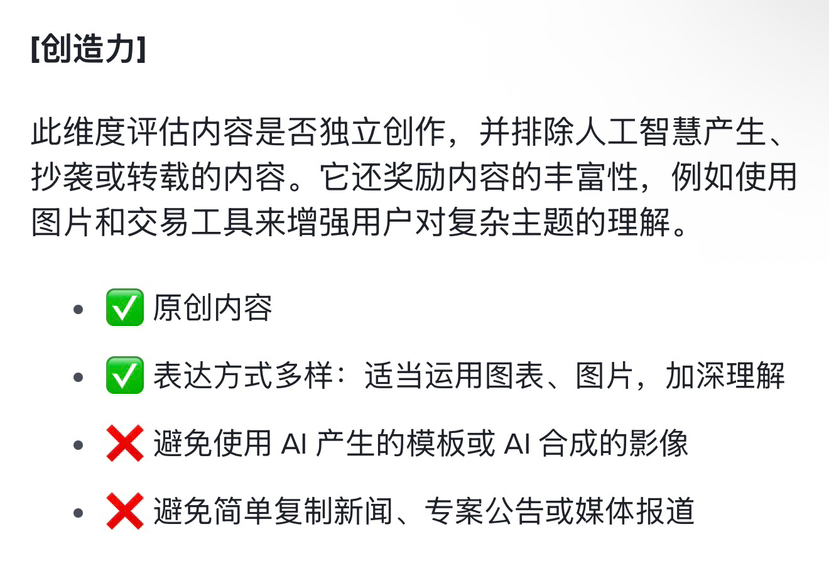 Pochodzi z oficjalnej aktualizacji 6 stycznia (Odnowienie platformy twórców (CreatorPad), punkty i nagrody są bardziej przejrzyste!), wtedy można było publikować 5 krótkich postów i 3 długie teksty dziennie, za każdy z nich odpowiednio 5 i 10 punktów. Teraz, chociaż zasady się zmieniły, długie i krótkie teksty mają po 100 punktów, ale nadal możemy dostrzec proporcje punktacji za obrazy przyznawane przez oficjalne źródła.