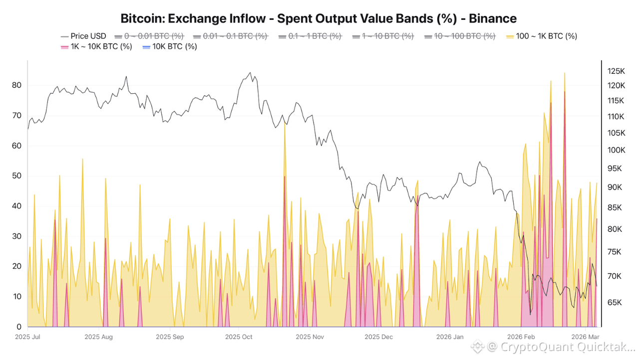 Several days were notably marked by inflows on Binance dominated by whale activity, representing more than 70% of total inflows. Here, whales are defined as transactions exceeding 100 BTC.