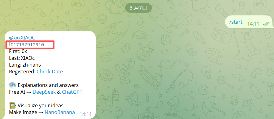 3. Bot automatycznie odpowie na Twoje informacje o koncie, w tym pokaże Twój Telegram User ID