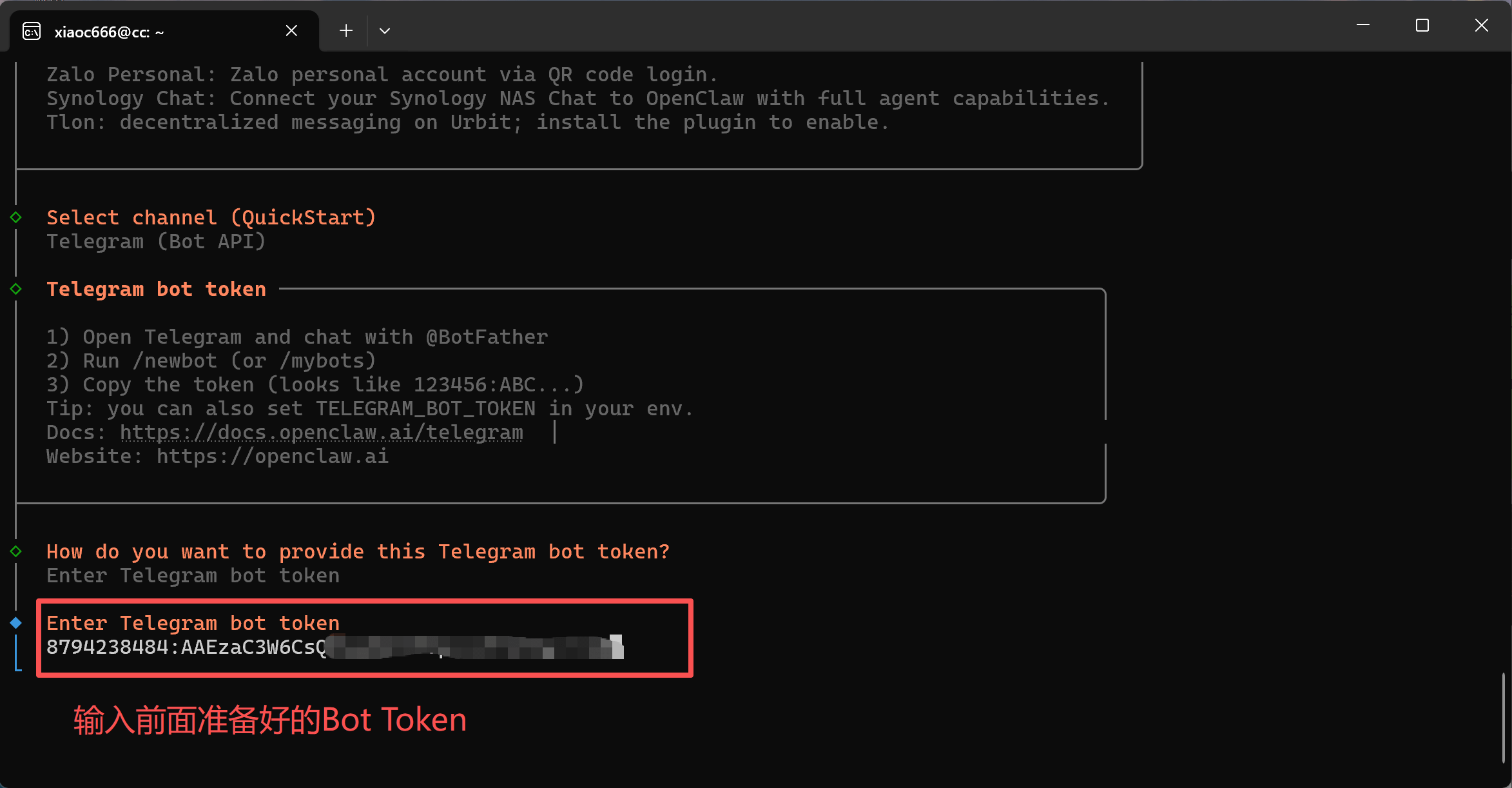 Następnie wprowadź wcześniej zapisany token bota Telegram