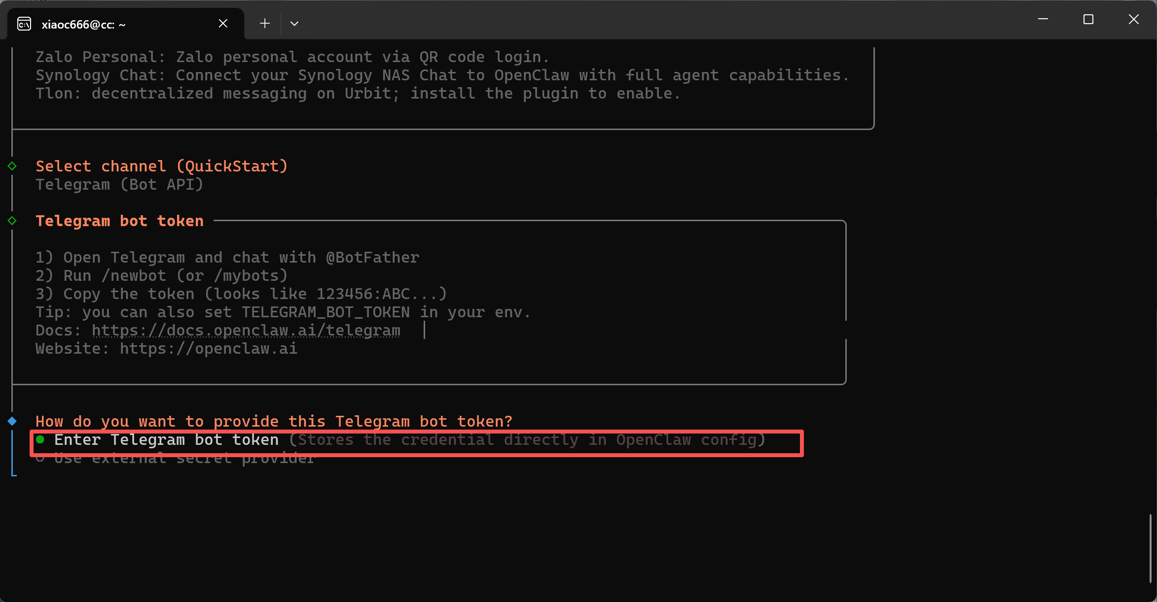 Następnie wybierz: Wprowadź token bota Telegram