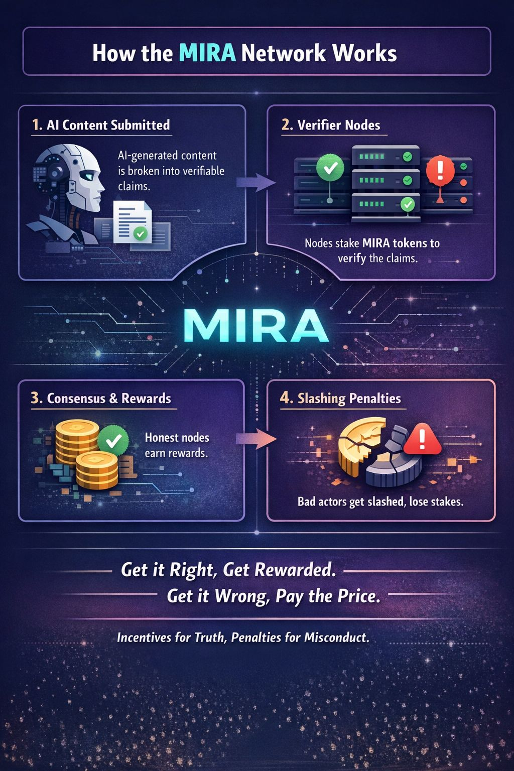 That’s the perspective I had in mind when I started digging into MIRA. At first, most people talk about it as a project that verifies AI outputs, which is already an interesting idea. But the detail that really caught my attention was something deeper than that. The network tries to make incorrect verification economically painful through slashing. For me, that’s not a small technical feature — it’s a serious design choice, and I think a lot of people overlook how important that can be.