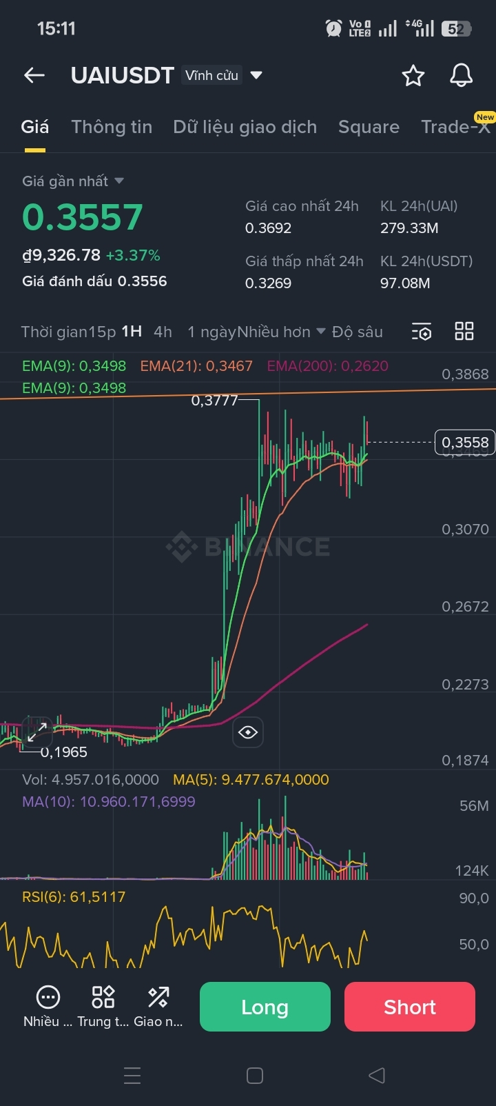 From the 1H chart, UAIUSDT is in a strong bullish trend. The price moved sharply from around 0.19 to 0.37, which is a very large impulse move. After this pump, the market entered a short consolidation phase around 0.34–0.36.