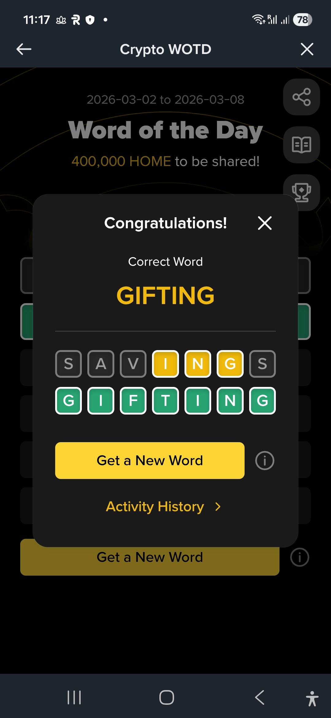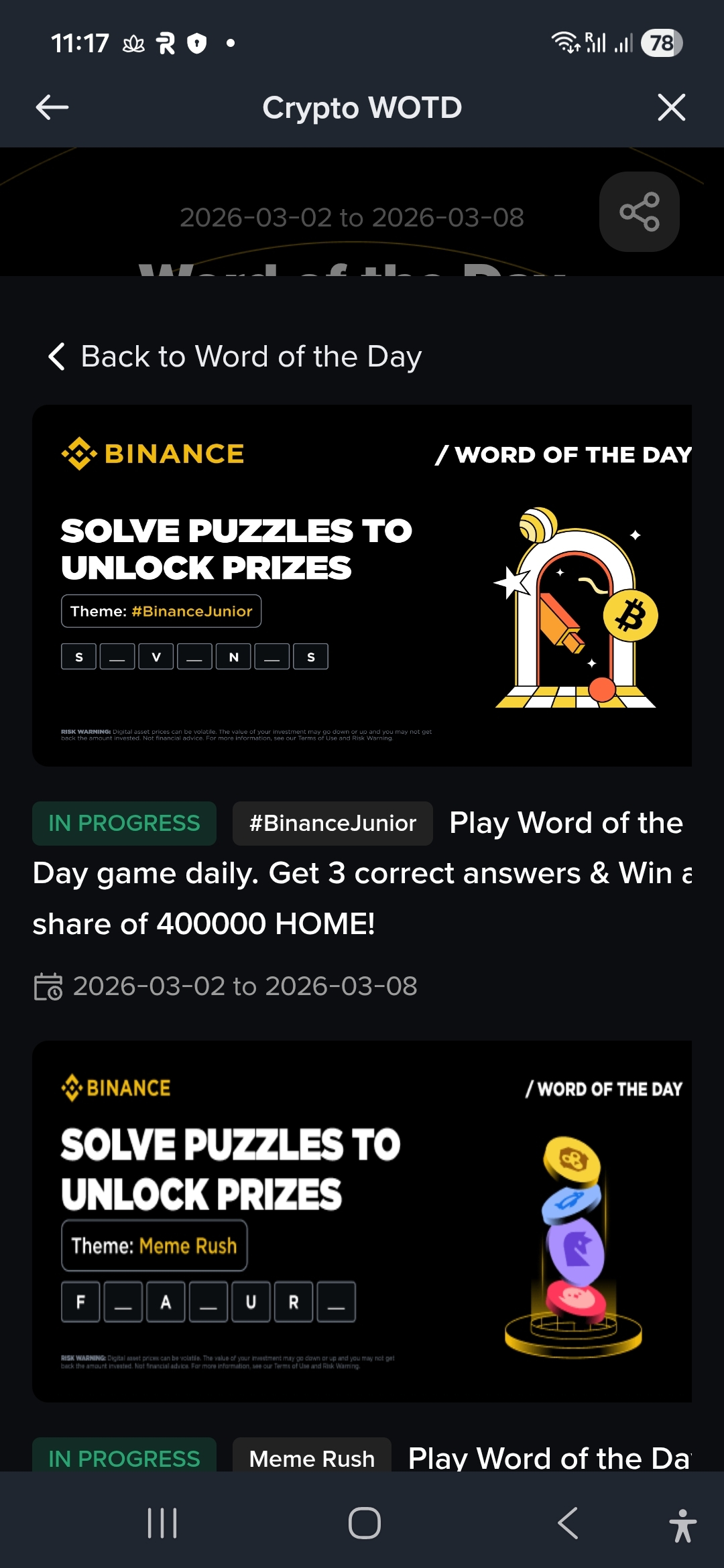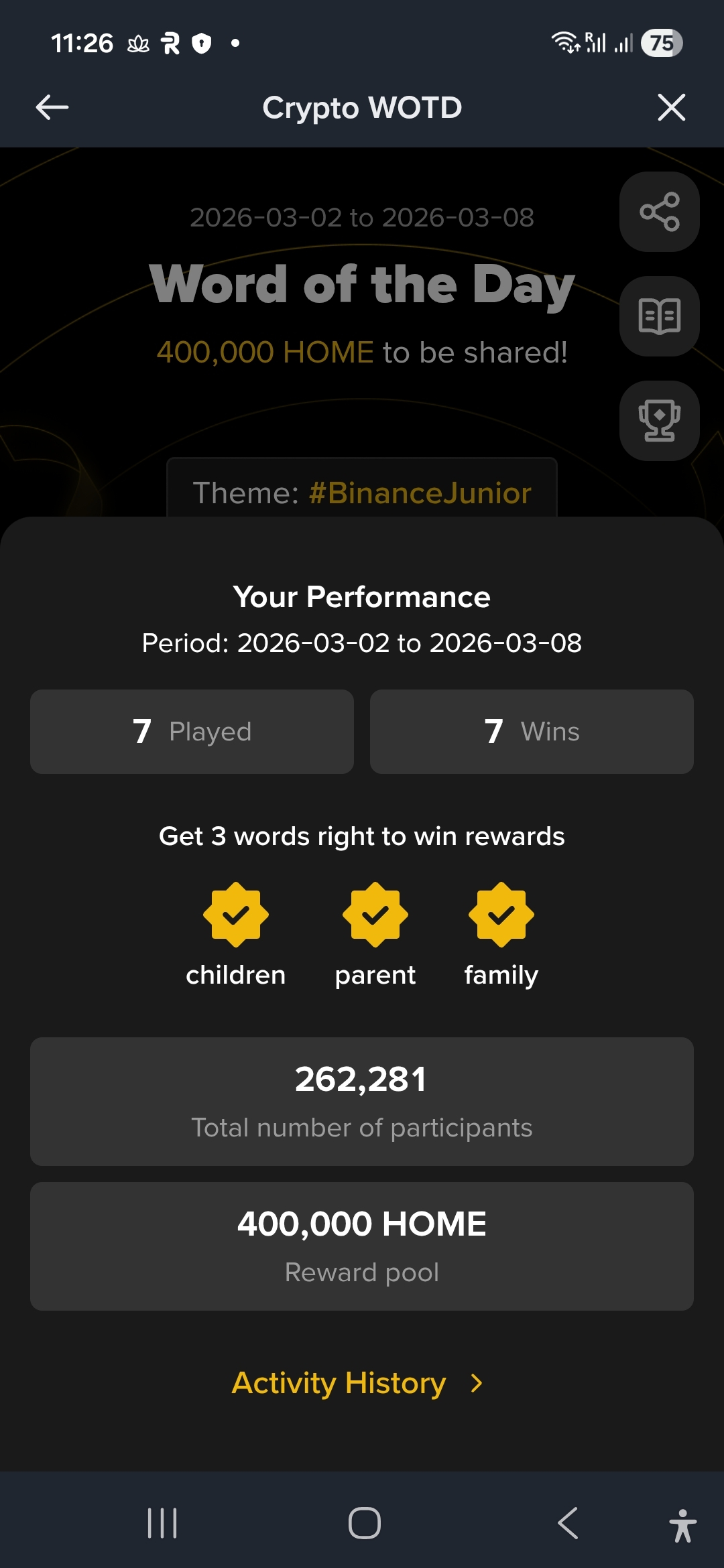 7/7 wins this week – officially in for the 400,000 HOME rewards pool with 262,281 participants! 💪 #BinanceWOTD #BinanceJunior #CryptoEducation