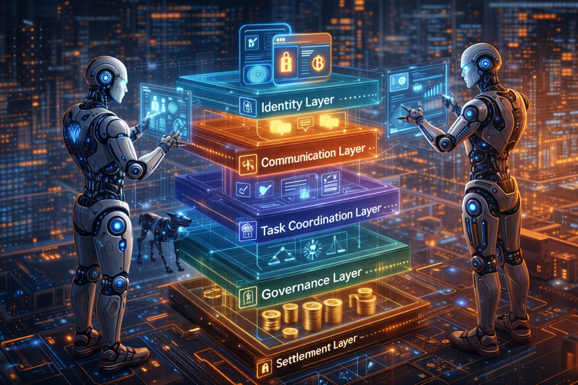 Each layer handles a different coordination problem. Identity establishes trust communication allows discovery task systems organize work governance defines rules settlement handles incentives.