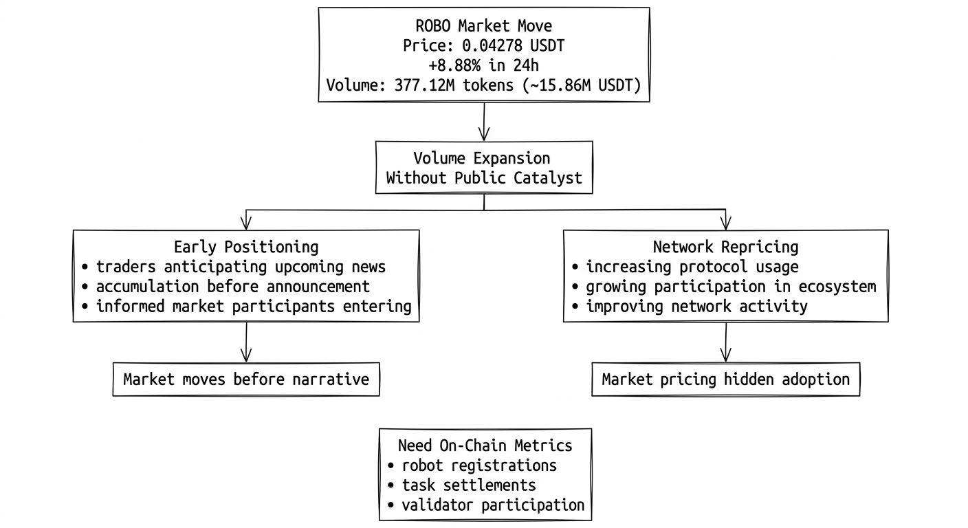 I have been watching ROBO long enough now to recognize when the market is testing something it has not fully decided on yet. Today the token closed at 0.04278 USDT, up 8.88 percent in 24 hours, with a 24 hour range between 0.03914 and 0.04358. That is not the part that caught my attention. What stood out was the volume surge. ROBO printed 377.12 million tokens traded in the last 24 hours, translating to roughly 15.86 million USDT. That is a meaningful jump from the sub-13 million we were seeing just yesterday, and it arrived without any obvious catalyst. No new exchange listing, no partnership announcement, no Fabric Foundation update that would explain why participation suddenly accelerated. Volume expansions like this usually mean one of two things. Either someone with conviction is building a position ahead of information the rest of us do not have yet, or the market is repricing ROBO based on something structural that changed quietly while most people were not paying attention.