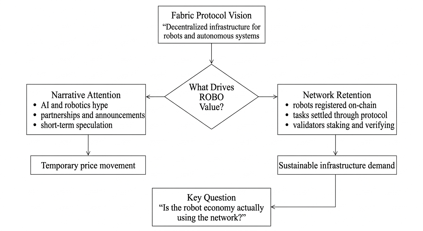 That distinction matters because Fabric Protocol is not a meme coin, and it is not a Layer 1 competing on transaction speed or gas fees. Fabric Foundation describes the network as infrastructure designed to help humans and intelligent machines work together safely and productively, with ROBO functioning as the token used for network fees, identity verification, staking, and governance. The whitepaper frames Fabric as a decentralized system to build, govern, own, and evolve general purpose robots, with the mission of creating coordination rails that allow machines, builders, validators, and users to interact through open protocols instead of closed corporate stacks. If that vision holds, then ROBO should not trade like a narrative token. It should trade like infrastructure, and infrastructure tokens derive value from usage, not from hype cycles. The problem is that right now I cannot verify whether usage is actually increasing, because Fabric Foundation has not published the onchain metrics that would let me track robot registrations, task settlements, validator participation, or x402 transaction volume. Without those numbers, I am left interpreting volume and price action, which is a weaker signal than I would like for a token positioning itself as critical infrastructure.