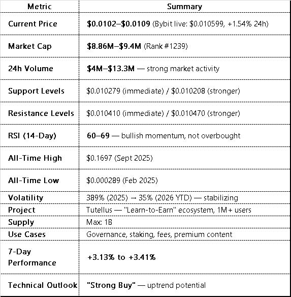 Price History & Volatility: In 2025, TUT had an extremely volatile year with a 389% price swing, starting near $0.0009 and reaching its peak of $0.1711 . So far in 2026, volatility has calmed to around 35%, with prices ranging between $0.0091 and $0.0200 .