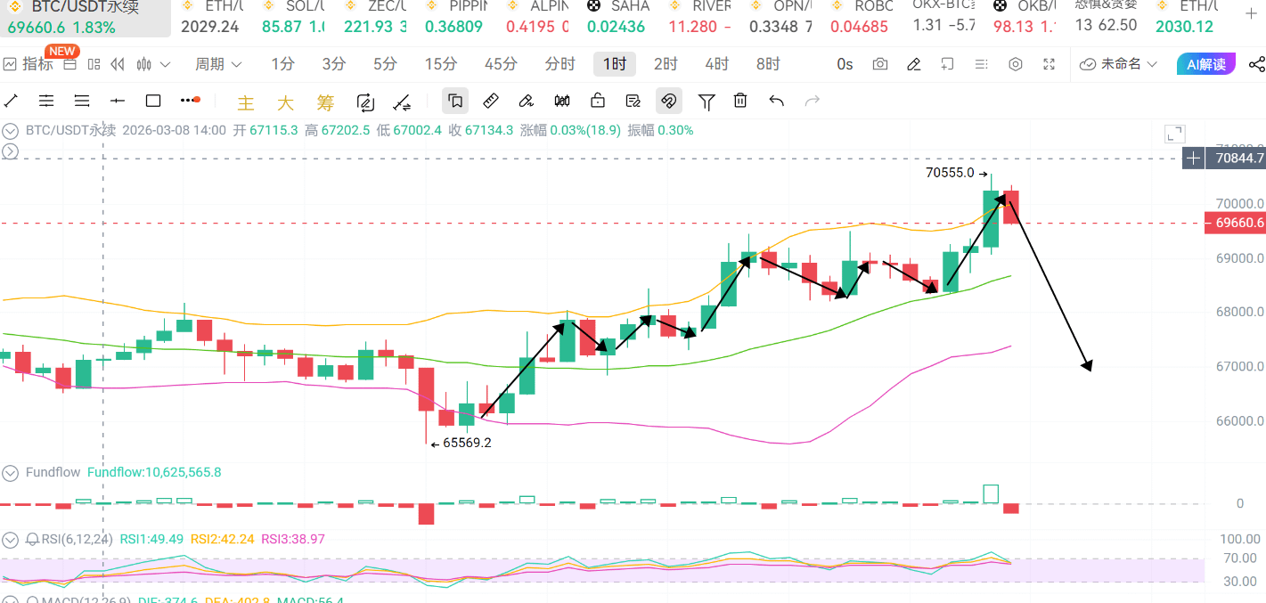从技术面看,反弹到71000附近就是强压力位。这时候肯定会有大量止损单涌出,庄家正好借着这波抛压往下砸盘。