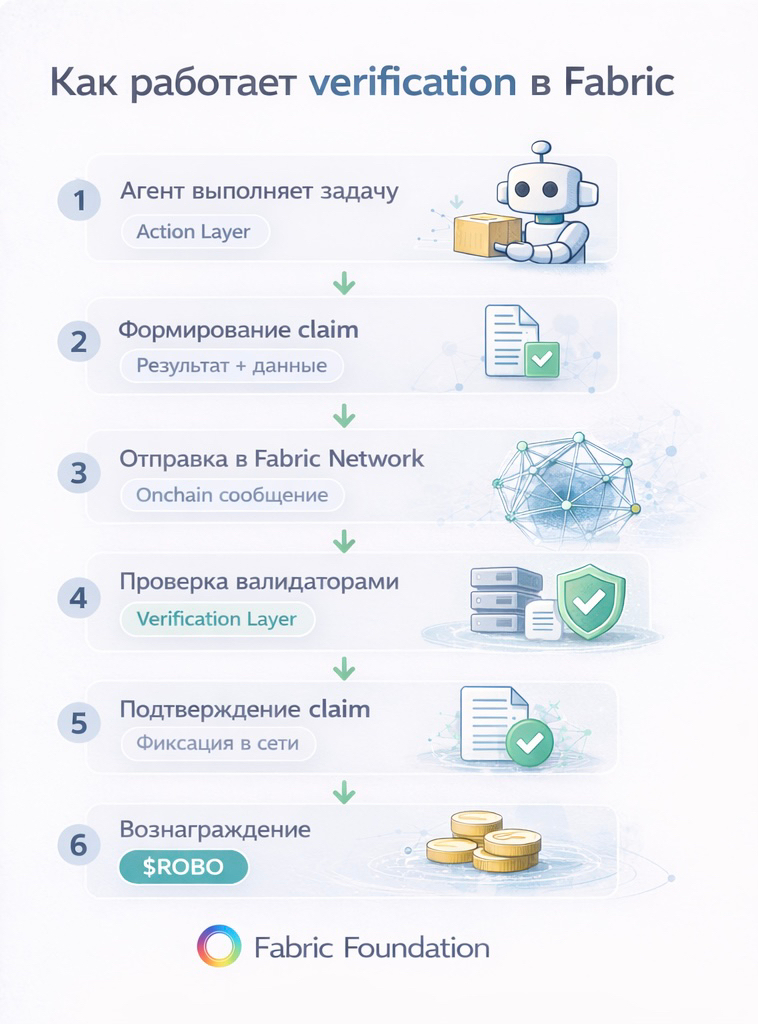 Физическая операция происходит на уровне action layer. Устройство выполняет задачу в реальной среде: перемещает объект, завершает вычисление или обрабатывает данные. После выполнения агент формирует сообщение о результате и отправляет claim в сеть. Подтверждение происходит на другом уровне архитектуры. В Fabric этот процесс относится к verification layer. Validators получают данные о выполненной операции и проверяют, совпадают ли параметры действия с заявленным результатом. Если проверка подтверждает корректность claim, сеть фиксирует выполнение задачи.