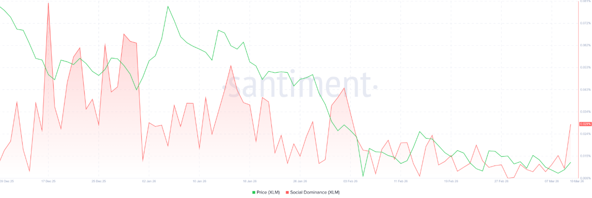 Dữ liệu on-chain của Stellar đang phát đi những tín hiệu tích cực ban đầu. Theo nền tảng phân tích Santiment, chỉ số Social Dominance – thước đo tỷ lệ thảo luận liên quan đến XLM trên các kênh truyền thông tiền điện tử – đã tăng đều kể từ cuối tháng 2, đạt 0,029% vào thứ Ba, mức cao nhất kể từ ngày 4/2. Đà gia tăng này cho thấy mức độ chú ý của thị trường đối với XLM đang dần cải thiện, đồng thời phản ánh tâm lý nhà đầu tư có dấu hiệu lạc quan hơn.