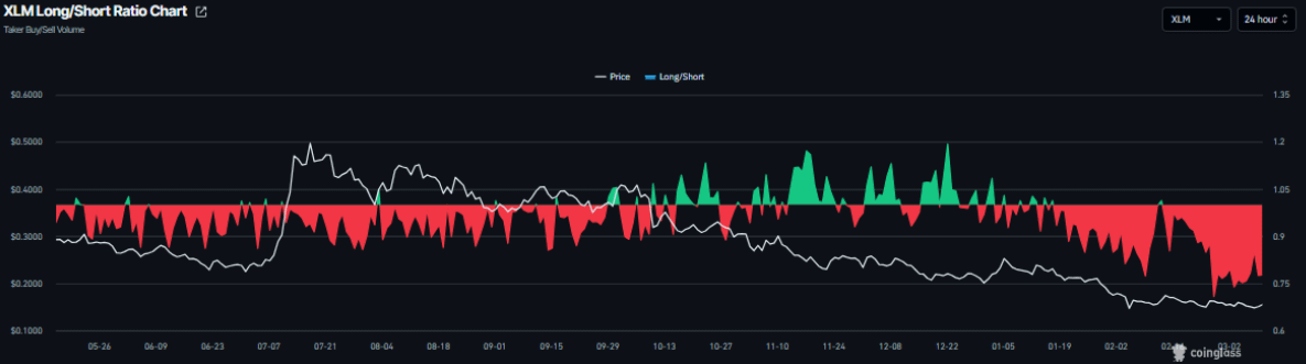 Bên cạnh đó, tỷ lệ long/short của Stellar trong cùng giai đoạn chỉ đạt 0,77; mức thấp hơn 1 phản ánh việc nhiều trader đang nghiêng về kịch bản giá giảm.