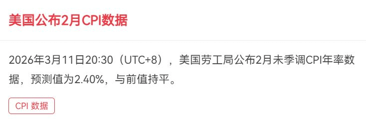 简单说,CPI就是咱普通人“菜篮子、钱袋子”的通胀温度计——测的是买菜、加油、购物这些日常开销,一年涨了多少。这次公布的2月CPI“预测值2.40%,与前值持平”,意味着美国通胀既没涨太快,也没涨太慢。