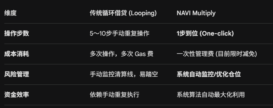 以前玩循环贷(Looping),你需要不停地:存入 → 借出 → 兑换 → 再存入。不仅操作繁琐、Gas 费叠buff,还得时刻盯着屏幕防清算。这对普通用户来说,门槛实在太高。