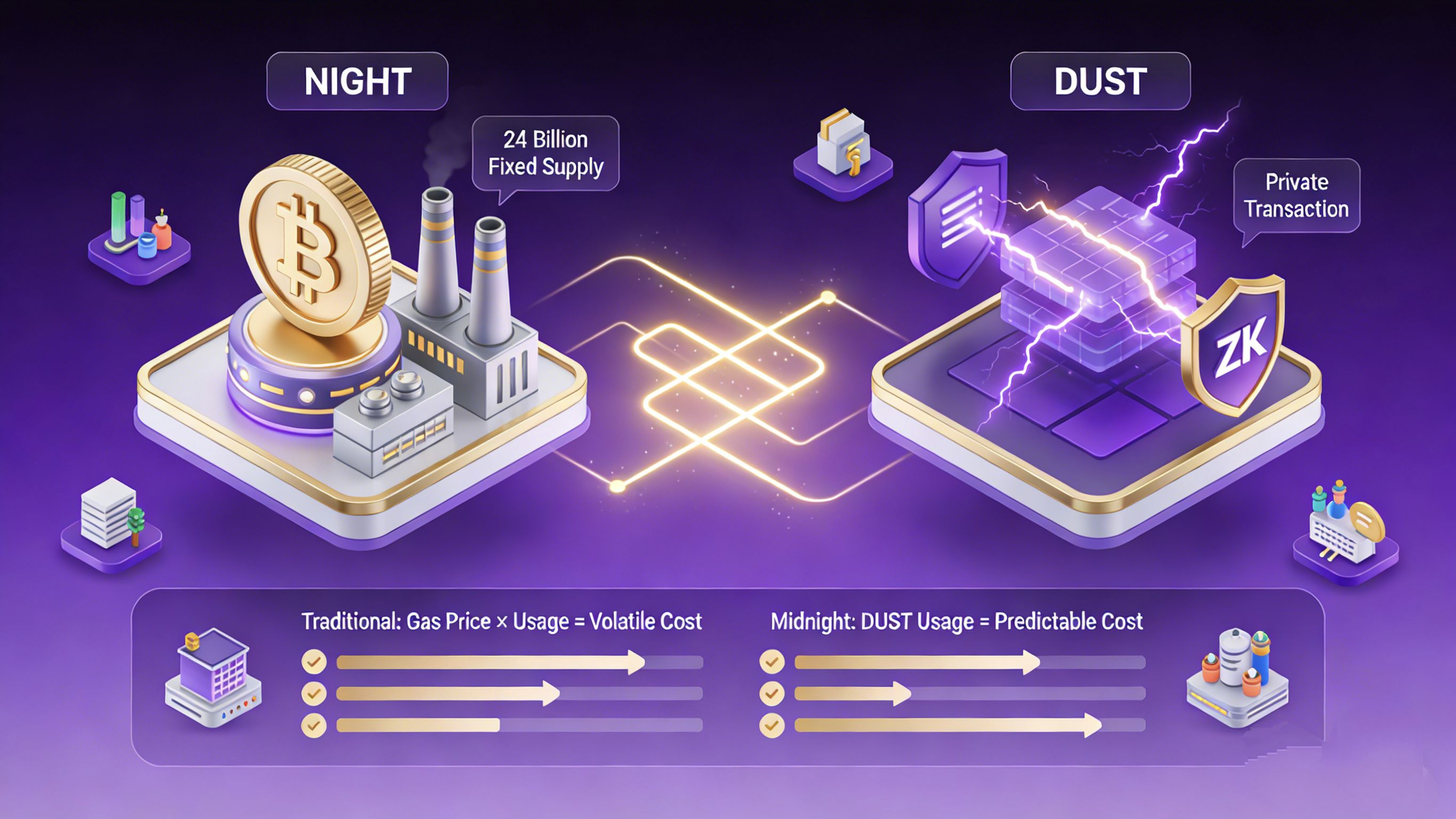 最巧妙的是它的双代币经济模型。$NIGHT 像发电厂,持有即产生价值;DUST像电力,使用即消耗不可储存。NIGHT总量24亿一次性铸造,DUST由NIGHT持续生成。这意味着企业预算可预测(不受币价波动),普通用户长期持有≈永久免费交易,监管机构也认可(DUST不可转移≠隐私币)。