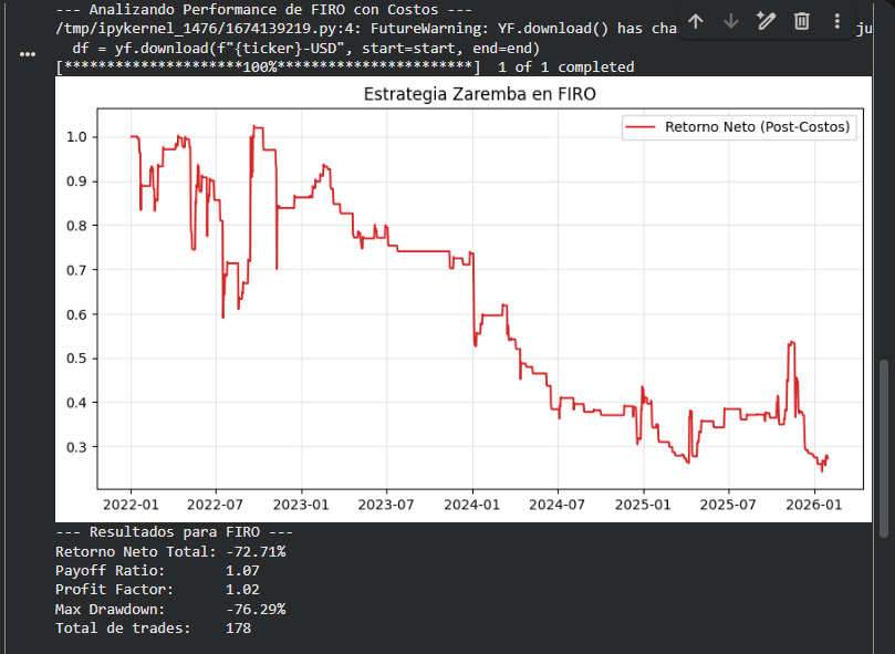 Por qué Zaremba: Al ser un activo DeFi de baja capitalización, presenta caídas del 5% seguidas de recuperaciones rápidas, lo que permite medir el Payoff Ratio de forma efectiva.