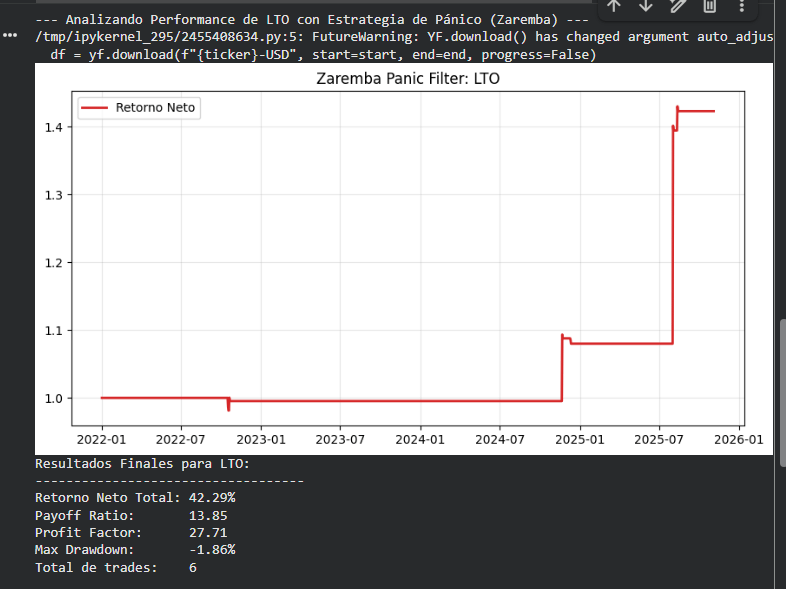 Payoff Ratio (13.85) y Profit Factor (27.71): Son números de un sistema "Francotirador". No operas mucho (solo 8 veces en 4 años), pero cuando lo haces, el rebote es masivo. Esto confirma que en LTO, una caída del 15% en tendencia alcista es una ineficiencia de liquidez que el mercado corrige con violencia al alza.