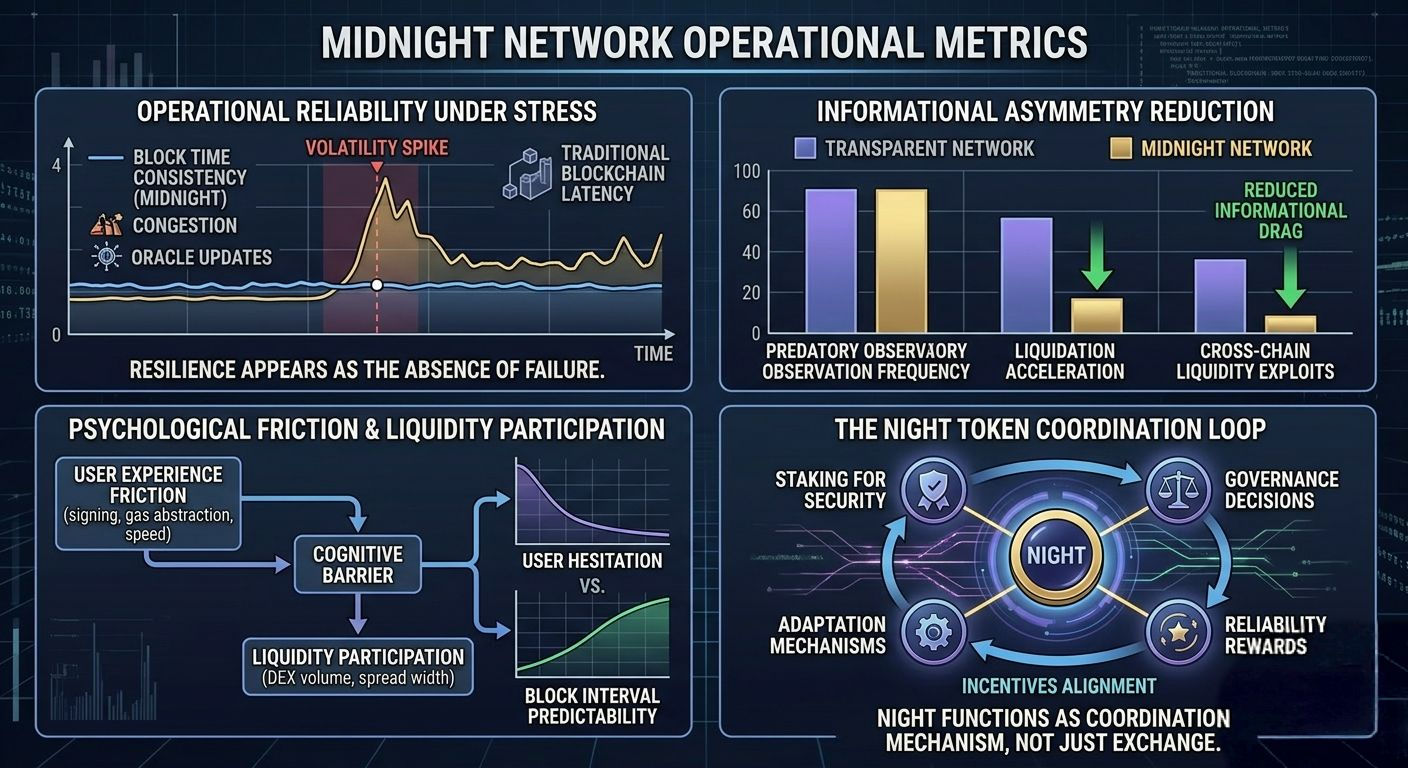 This is where Midnight Network’s focus on informational verification rather than raw transparency becomes interesting. By reducing the exposure of sensitive transaction details, the system potentially reshapes how adversarial actors exploit market stress. Without immediate access to full position data, opportunistic liquidation strategies may become less predictable.