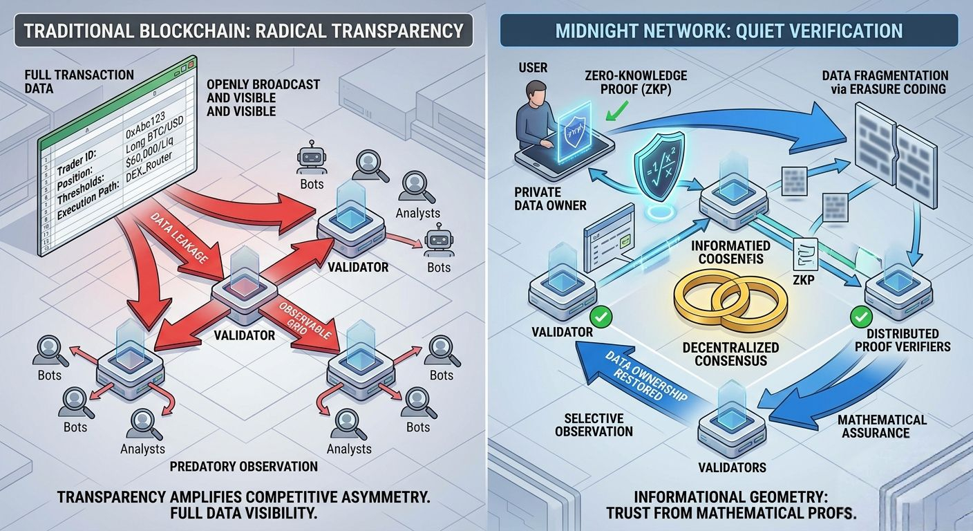 There is a subtle cost in crypto markets that I sometimes call informational drag. It’s the friction that appears when a system claims decentralization but quietly centralizes the most important resource: data visibility. Traders may hold their own keys, validators may run across continents, and blocks may propagate quickly. Yet if the meaningful information about positions, identities, and execution paths is concentrated in a few observable datasets, the network begins to behave less like a decentralized market and more like a transparent surveillance grid. When I look at Midnight Network and its native asset NIGHT, what stands out to me is the attempt to reduce that informational drag through the application of Zero-knowledge proof systems. Not by hiding everything, but by letting verification exist without unnecessary exposure.