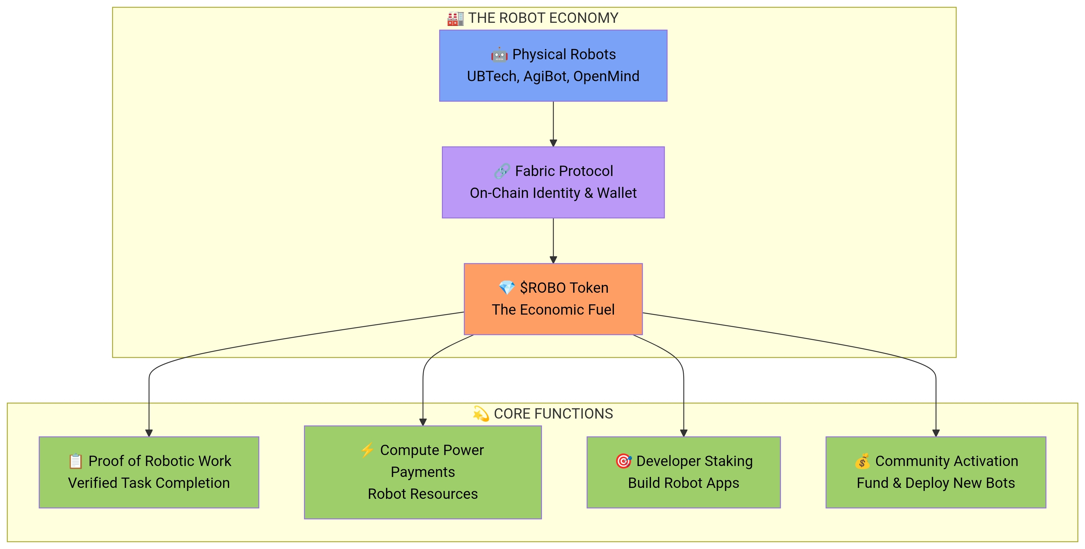 Here’s the simple version: right now a robot from UBTech or AgiBot can walk, talk, maybe even make you coffee. Cool. But it has zero way to get paid, prove it showed up for the job, or even hold its own wallet. Fabric gives every machine its own on-chain identity and wallet. Suddenly robots become actual economic players. And the token that powers the whole circus is $ROBO.