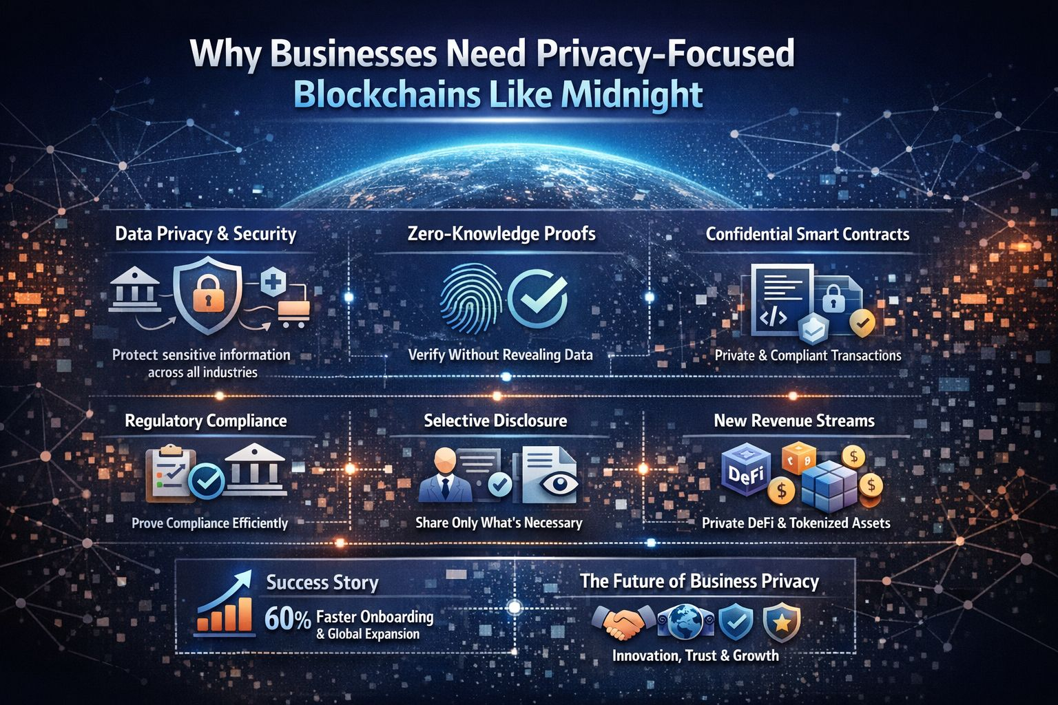 W dynamicznym świecie innowacji cyfrowych, firmy przyjmują technologię blockchain, aby napędzać wzrost, efektywność i nowe możliwości. Skoncentrowane na prywatności blockchainy, takie jak Midnight, stają się niezbędnymi narzędziami, które umożliwiają firmom zarządzanie wrażliwymi informacjami z całkowitą pewnością. Łącząc potężne możliwości weryfikacji z silną ochroną danych, Midnight pomaga organizacjom budować zaufanie, spełniać oczekiwania regulacyjne i odblokowywać ekscytujące modele biznesowe w Web3.