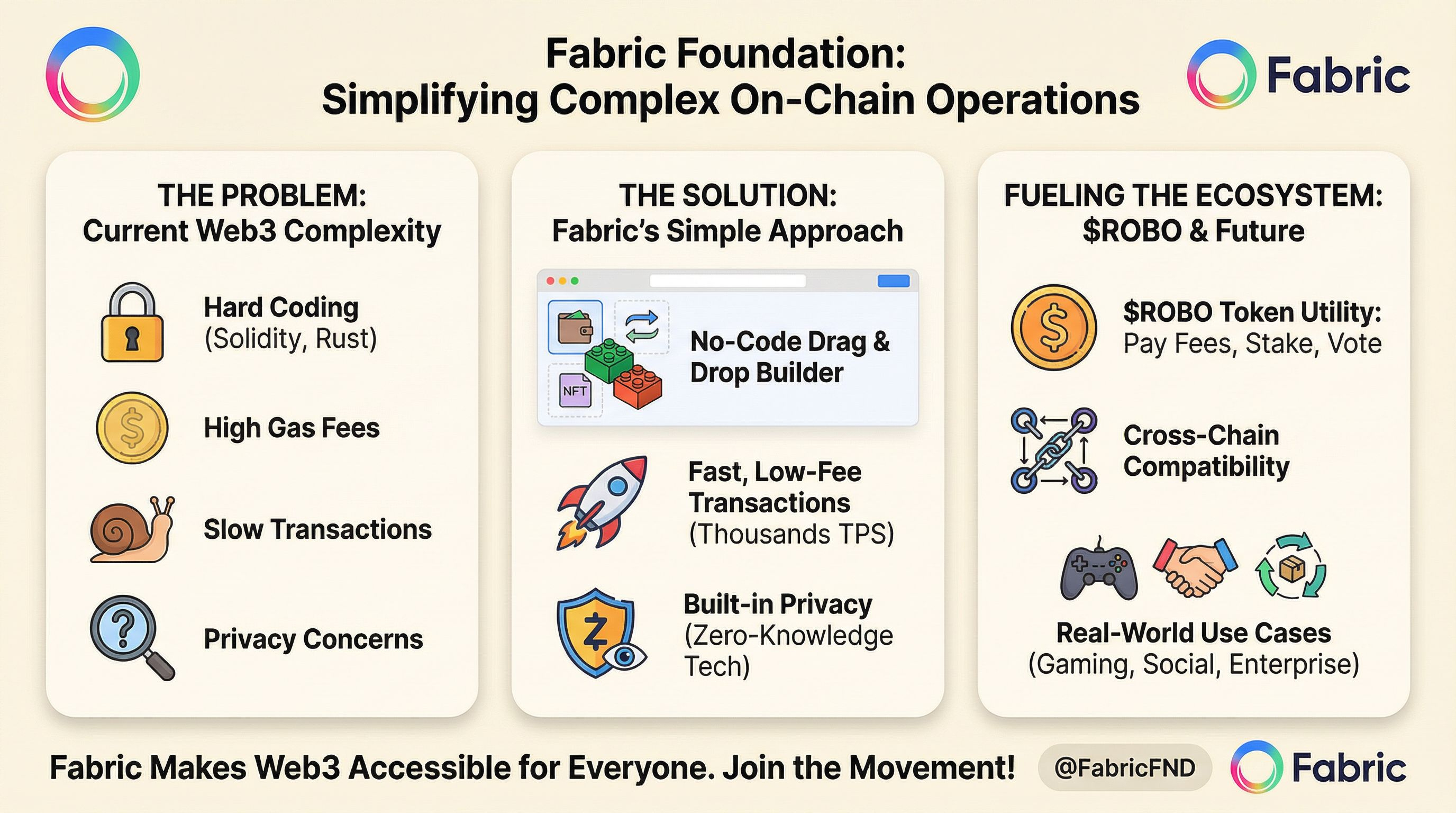 Most blockchain project make everything so hard. You need know coding like pro, pay high gas fee, wait long time for transaction, and still worry about privacy. But Fabric Foundation change all this. They make complex on-chain operations super simple for normal people like us.First thing I like is their easy tools. In normal Web3, to make dApp you write smart contract in Solidity or Rust. It take months, many bugs, and cost lot money to test. Fabric give drag-and-drop builder. Like you play with Lego blocks! You pick ready pieces – wallet connect, token swap, NFT mint, voting system – and just connect them. No need write one line code if you no want. For people who know little code, they can add custom part too. This mean small team or even single person can build full app in days not years.Second, speed and cost. Many chain slow and expensive now. Fabric use special layer that make transaction fast like normal app and fee very low. You no feel pain when use. They say in whitepaper it handle thousands transaction per second. Good for gaming, social app, DeFi where need quick move.Third, privacy come built-in. Not like some project add privacy later. Fabric make sure your data stay private by default. Use zero-knowledge tech so you prove thing without show all info. Like show you own token without tell how much or from where. This big deal because now people scare big company or hacker see everything.Now talk about $ROBO. This token is like fuel for whole Fabric world. You use $ROBO pay small fee when build or use app. If you stake $ROBO, you get reward and help secure network. Also big power – holder vote what new feature add next. Total supply fixed, no crazy inflation. So when more people build on Fabric and use dApps, demand for $ROBO go up. I think this make $ROBO strong in long run.Why this important for us in India? Many young people here want start crypto project but no money for dev team or expensive tools. Fabric open door for them. Student like me can make own mini game or social token app. Farmer can make simple supply chain tracker. Small shop can do loyalty program on chain. All without big risk or hard study. This bring real adoption. Not just rich people or big company enjoy Web3. Everyone can join.Fabric Foundation also think about future. They plan connect with other chain easy. So your app work with Ethereum, Solana, Cardano user too. No lock in one place. And they focus on real world use – not just hype. Like in whitepaper they talk about enterprise too, big business want private and simple blockchain. Fabric give both.I feel excited because project like this make crypto less scary. Before I think Web3 only for smart coder or rich investor. Now I see hope. Simple tools + fast chain + privacy + good token = perfect mix. Many people will come and build cool thing.If you new to this, just go check Fabric Foundation. Read whitepaper slow slow, see demo on site. You understand why I say complex operations now simple. Follow @FabricFND