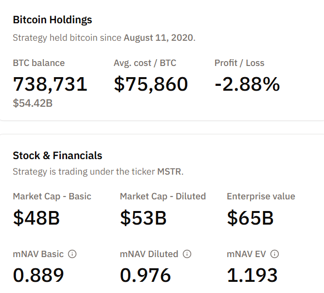 При цене биткоина чуть выше $73 000, портфель Strategy несет значительные нереализованные убытки по сравнению со средней ценой покупки — около $75 860 за монету.