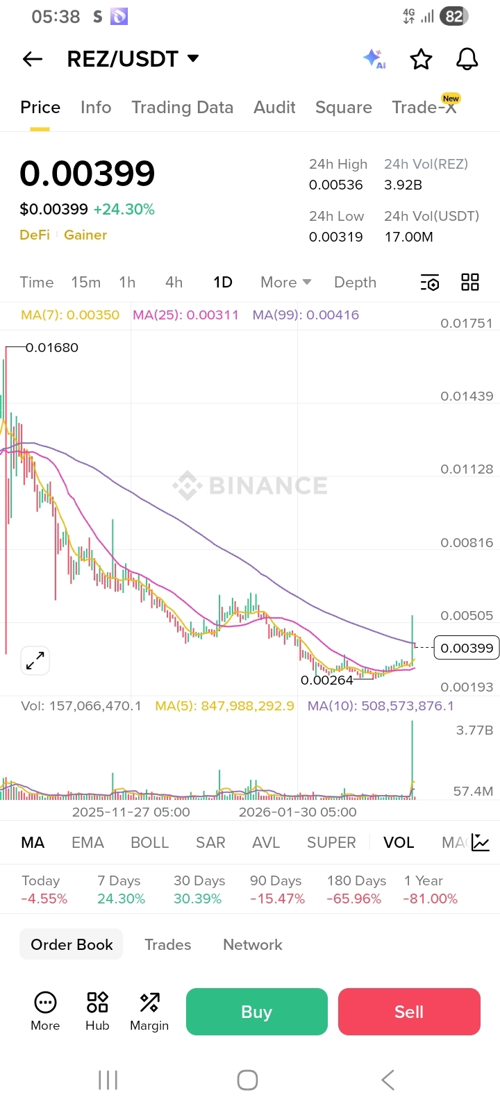 * Momentum: A 24-hour surge of +24.30% with a massive volume spike (3.92B REZ) confirms strong buyer interest.